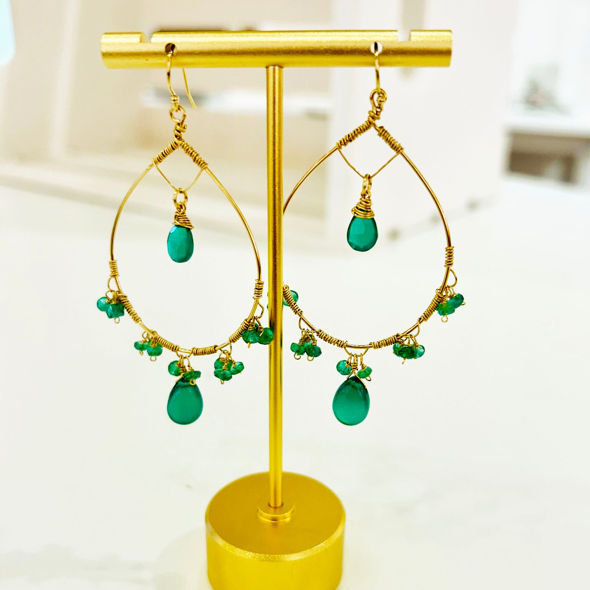 Immerse yourself in the timeless allure of nature's finest with our handmade 18K gold fill hoop earrings, adorned with natural top-quality emerald beads and green onyx gemstones. Each pair is a masterpiece of craftsmanship, meticulously crafted to exude elegance and sophistication.