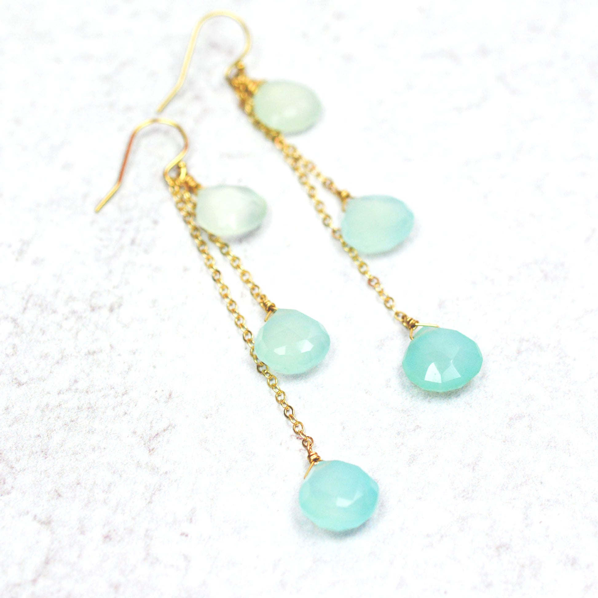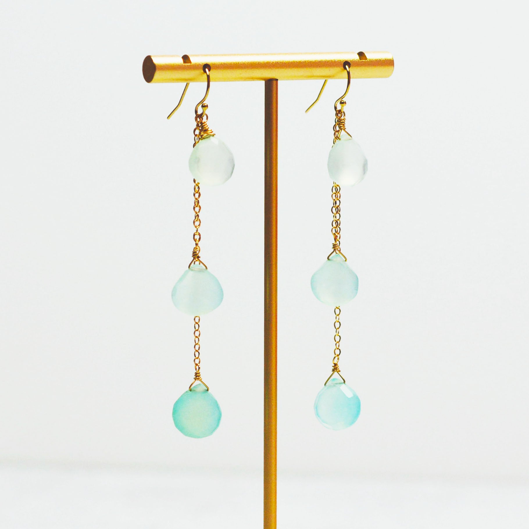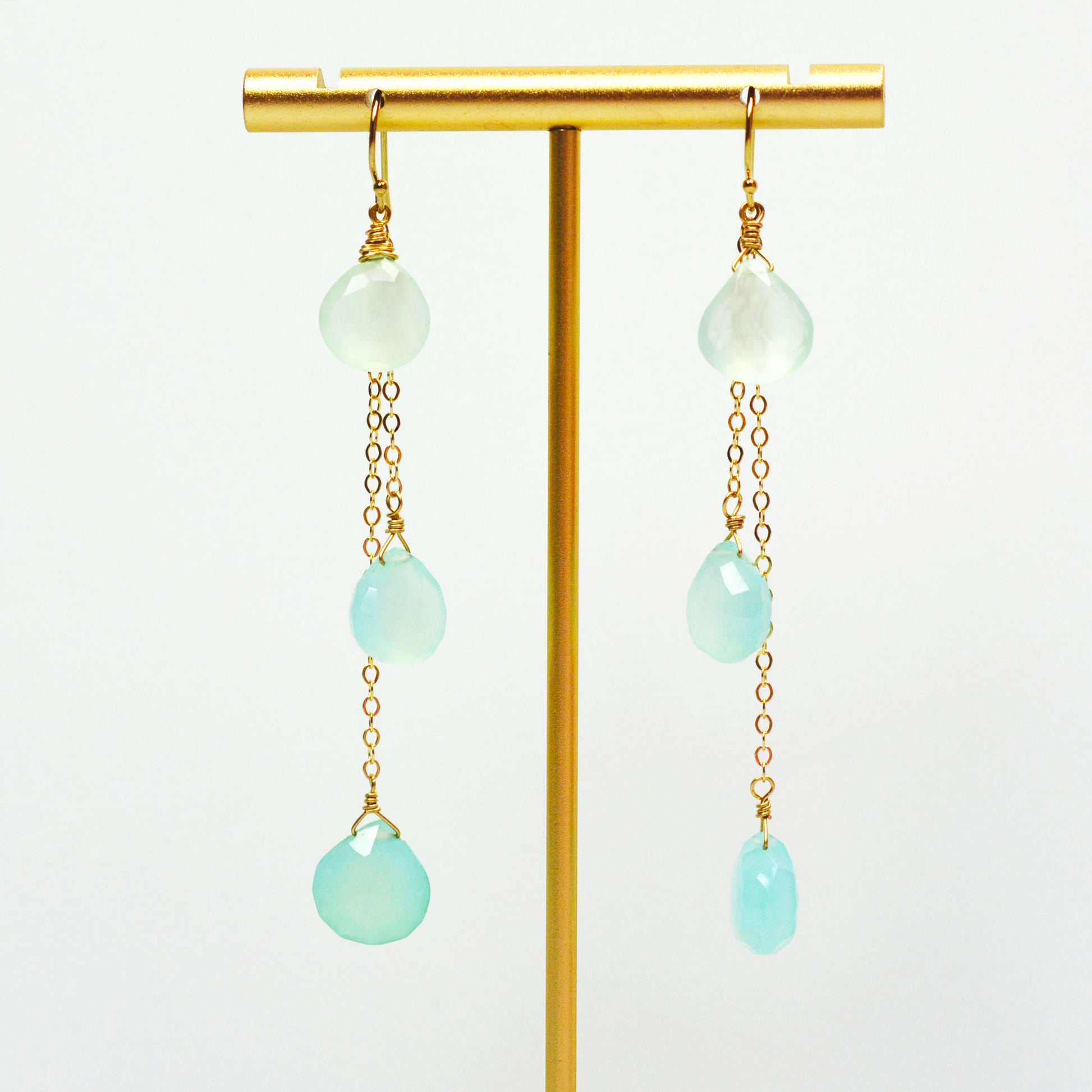 Elevate your spring and summer ensembles with these enchanting long dangly earrings, adorned with three mesmerizing aqua chalcedony gemstones. Crafted with precision and elegance, each earring features 18K gold fill chain and wires, adding a touch of luxury to your look.