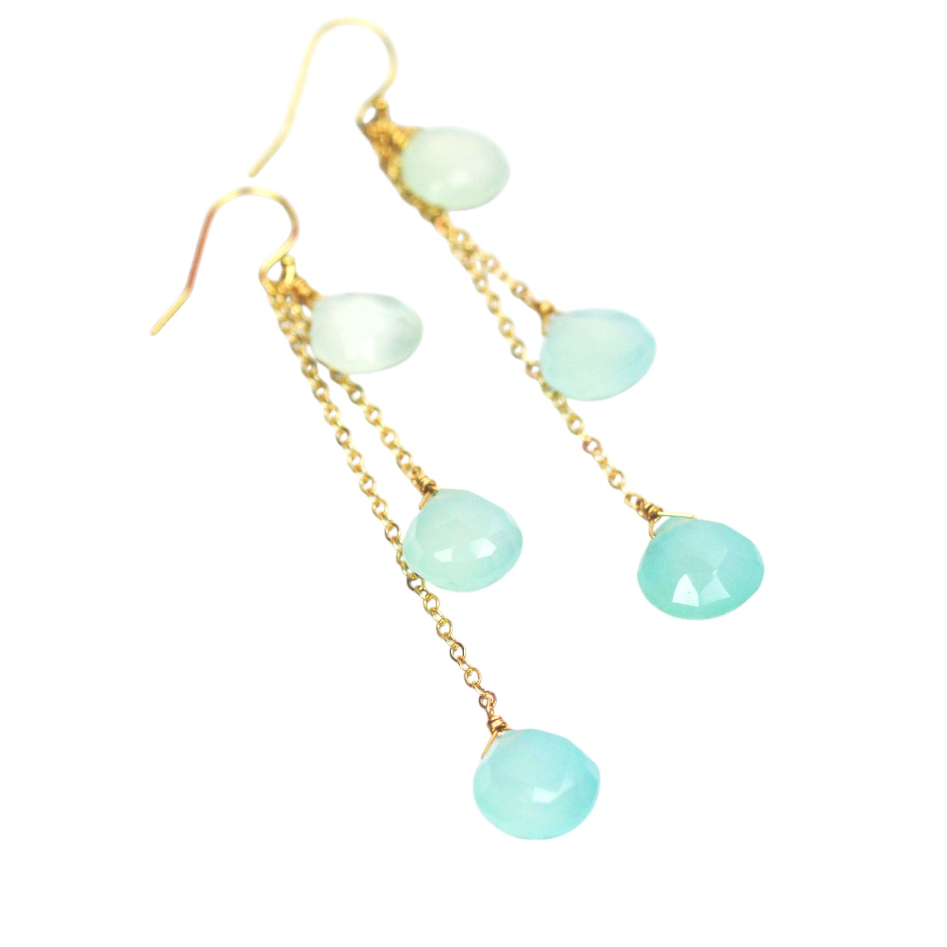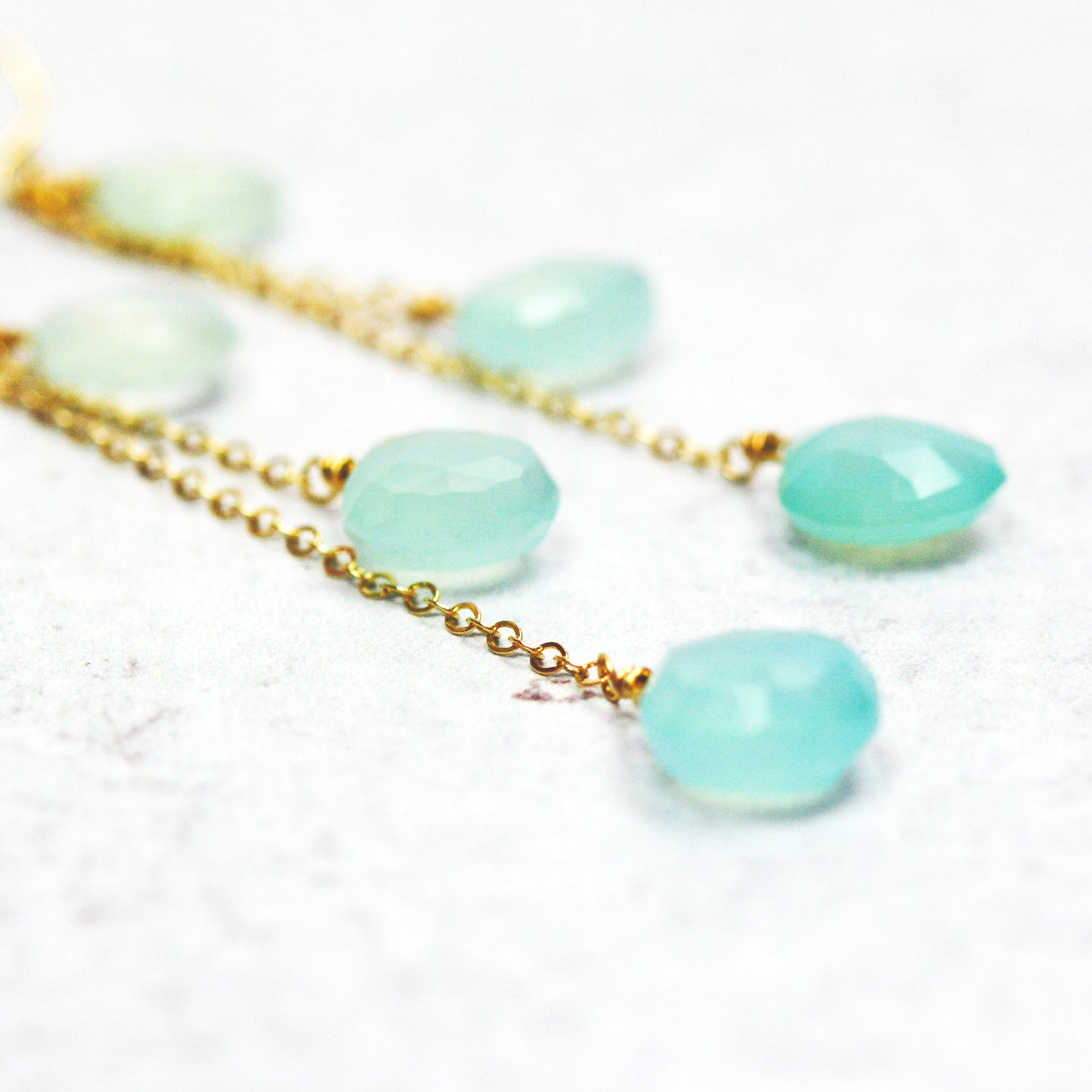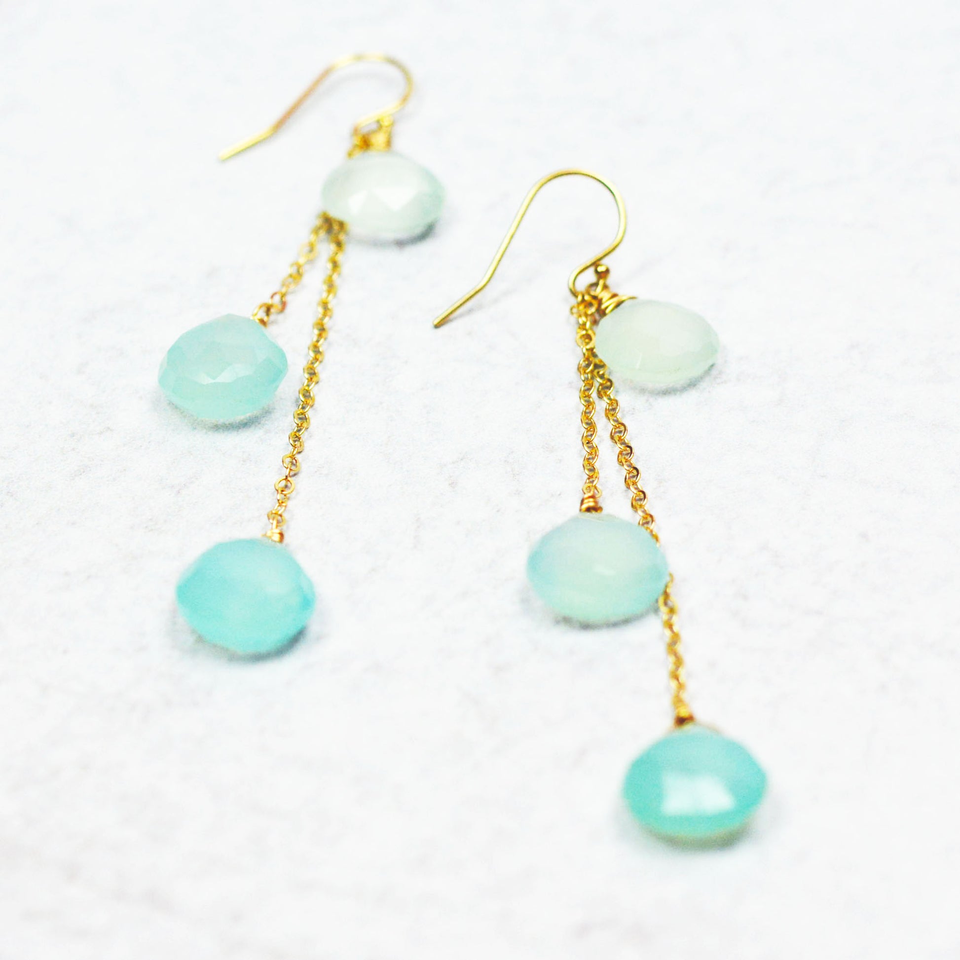 Elevate your spring and summer ensembles with these enchanting long dangly earrings, adorned with three mesmerizing aqua chalcedony gemstones. Crafted with precision and elegance, each earring features 18K gold fill chain and wires, adding a touch of luxury to your look.