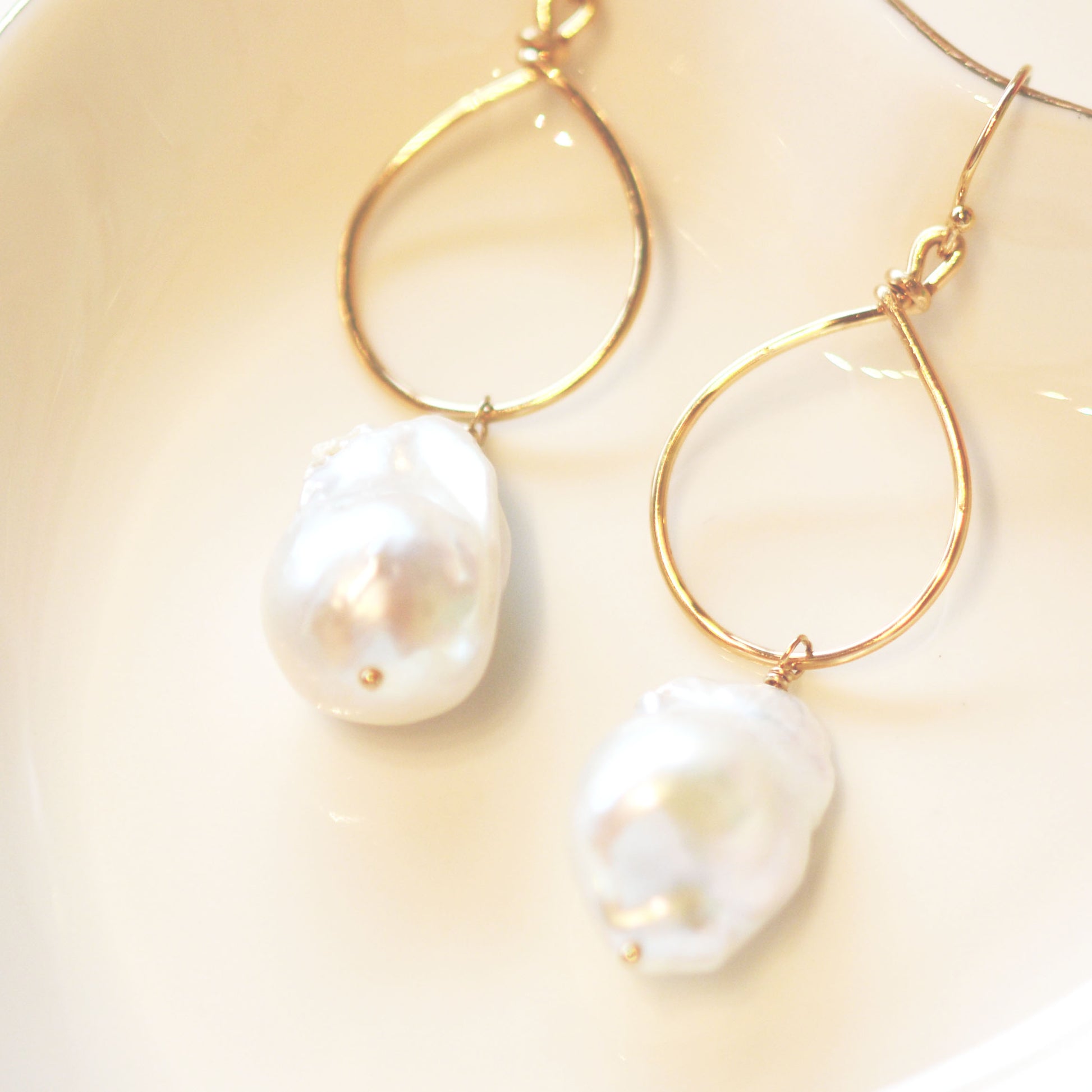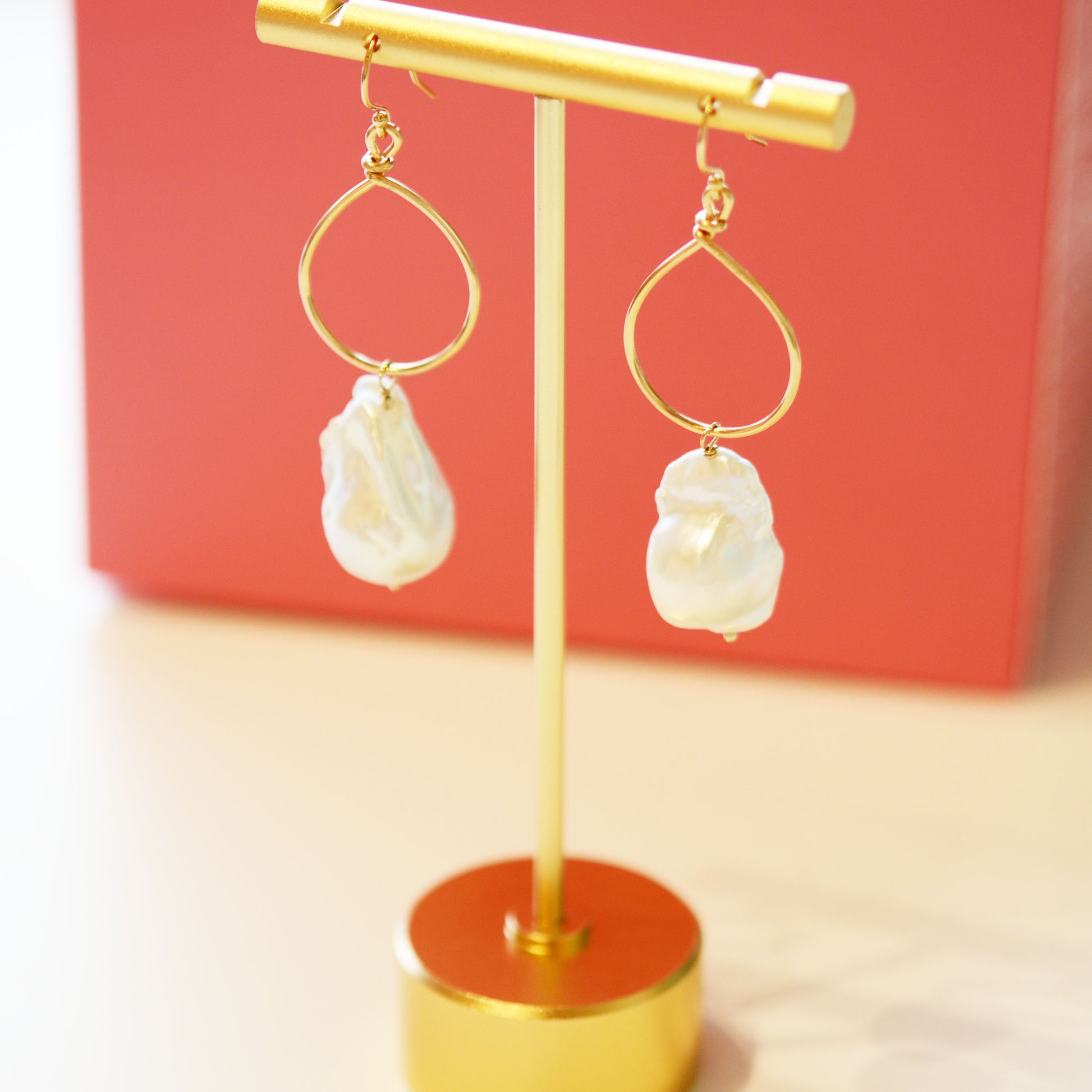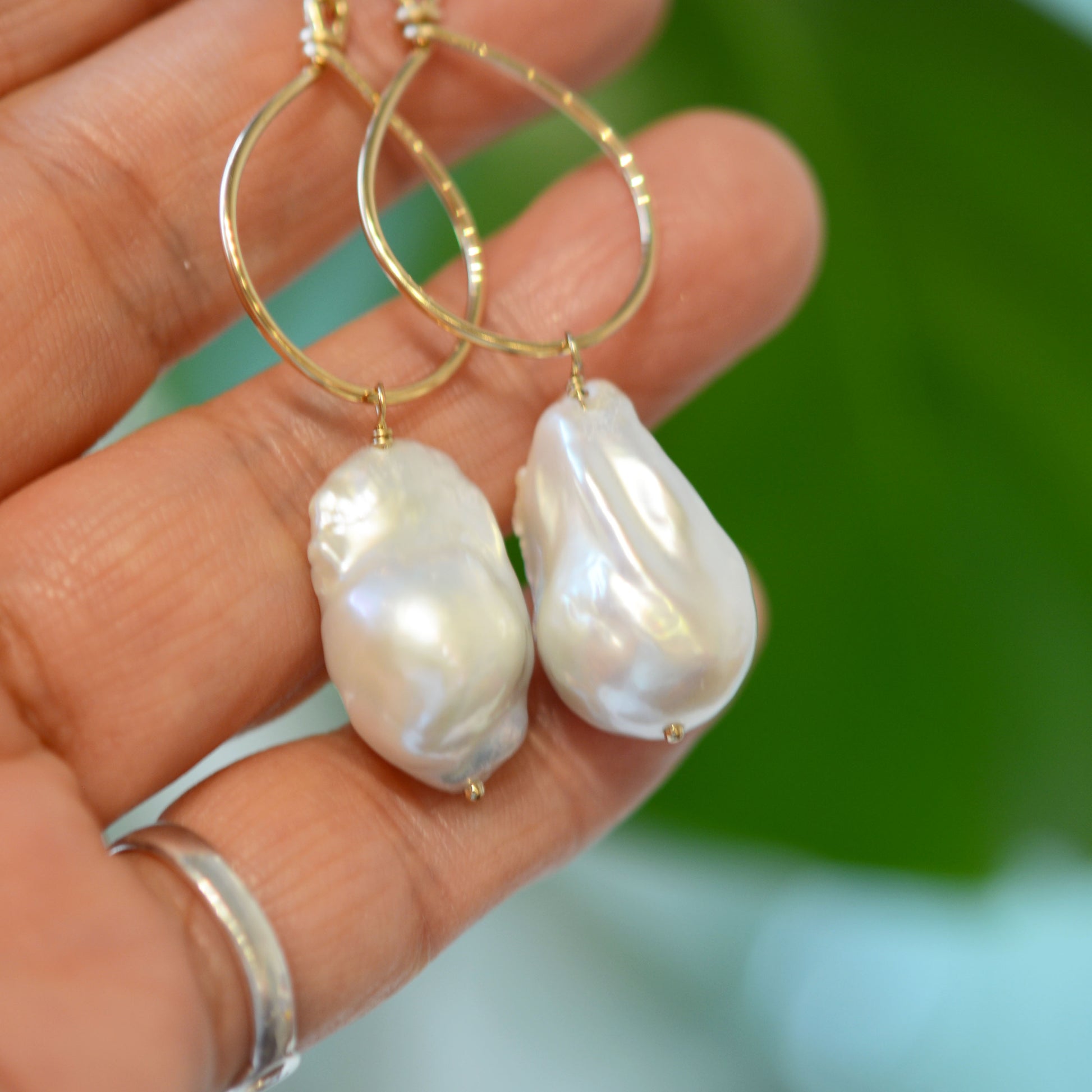 Elevate your elegance with our exquisite handmade hoop earrings, featuring rare quality baroque pearls delicately suspended from 18K gold fill wires. Each pair is a testament to sophistication and individuality, meticulously crafted to add a touch of timeless beauty to any ensemble.