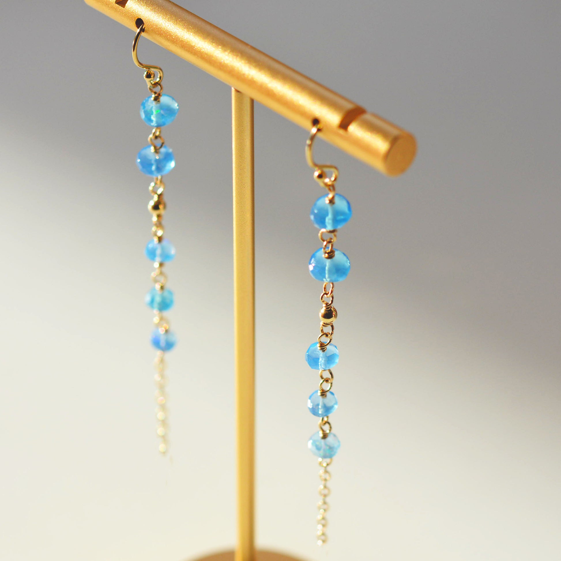 Rainbow blue opals dangle gracefully from slender chains, allowing them to sway with every movement, like gentle waves caressed by the wind.