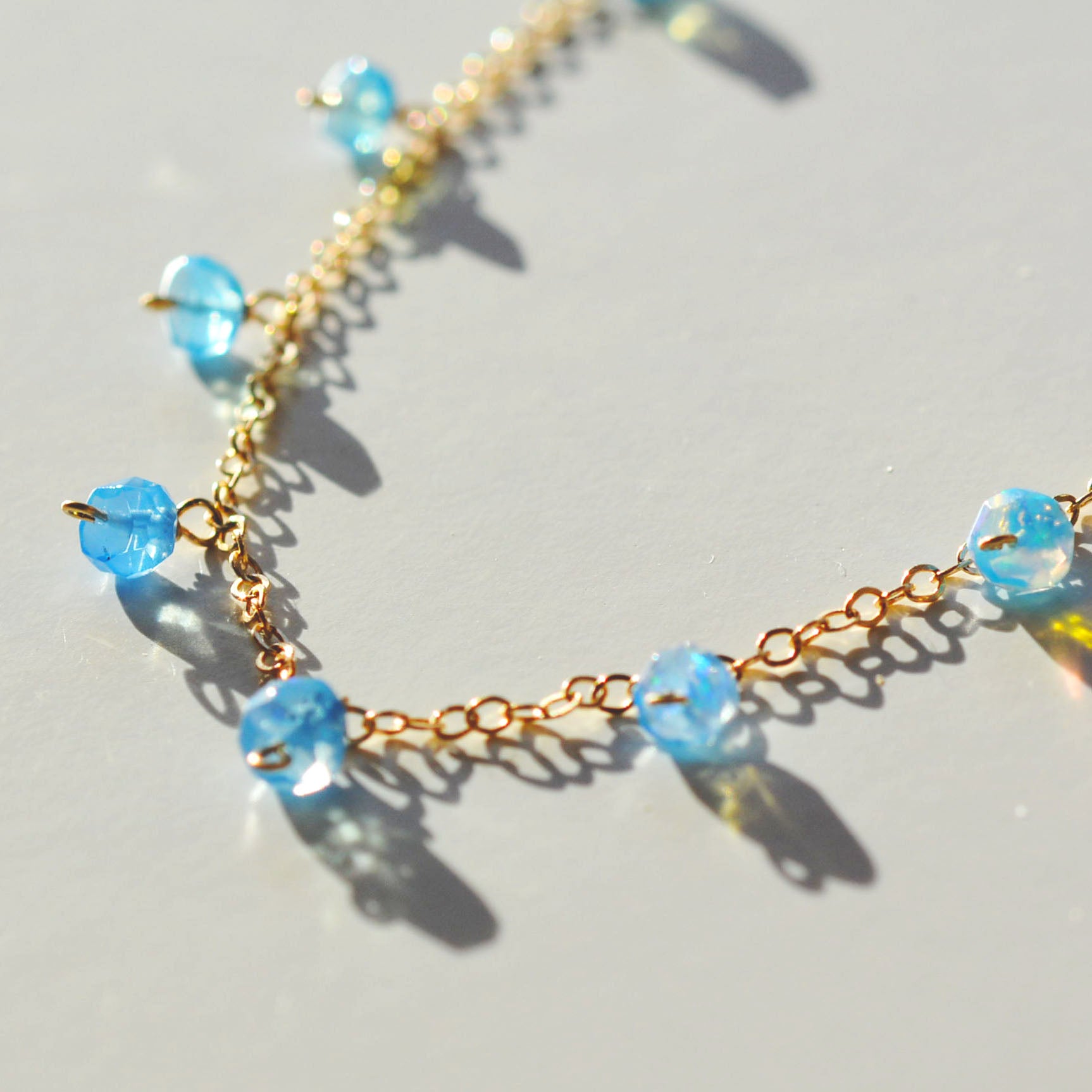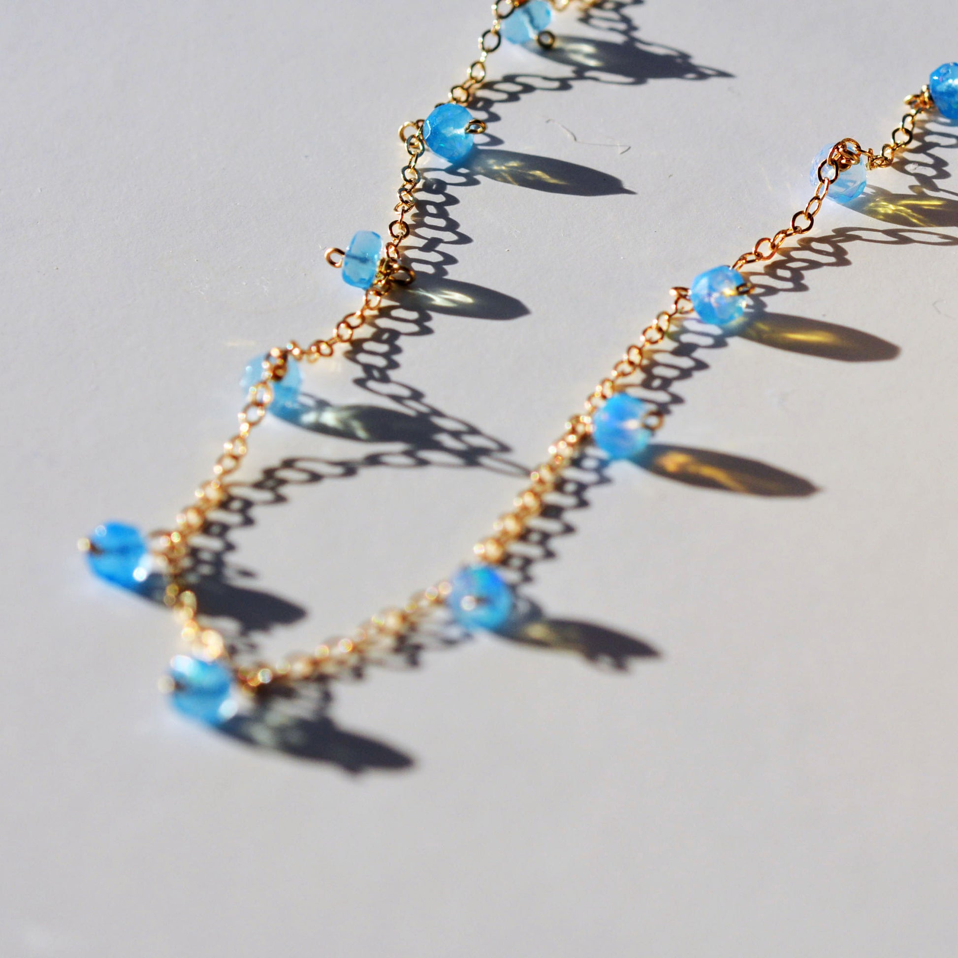 Embrace the enchanting allure of the sea with this exquisite handmade blue opal necklace, a celestial masterpiece destined to grace your neckline with ethereal beauty. Crafted with meticulous attention to detail, this necklace is designed to be a versatile addition to your jewelry collection, serving as a stunning layering piece or a captivating standalone accessory.