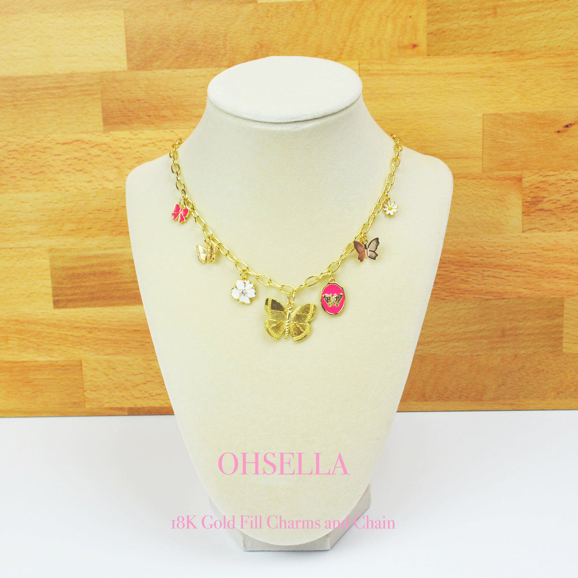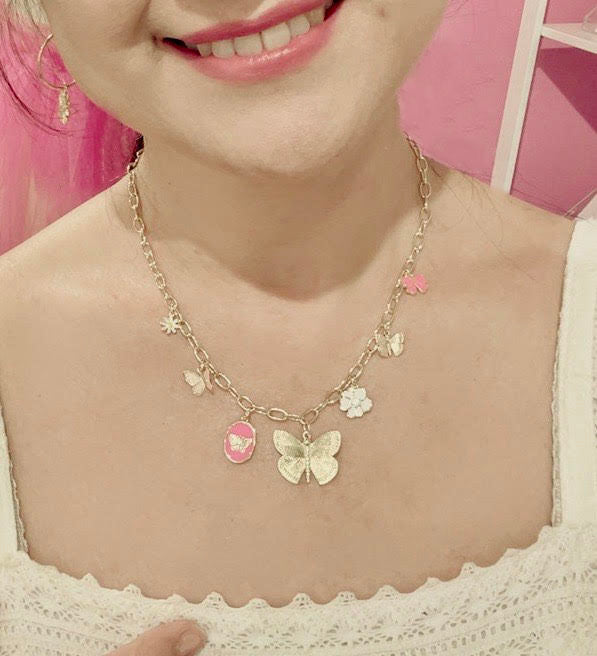 This delicate and whimsical charm necklace is crafted by hand, using premium 18K gold-fill materials that ensure lasting quality and shine. The necklace is adorned with finely detailed butterfly and flower charms, creating a playful and elegant aesthetic. A soft ribbon charm adds an extra touch of charm and femininity to the piece, making it truly unique.