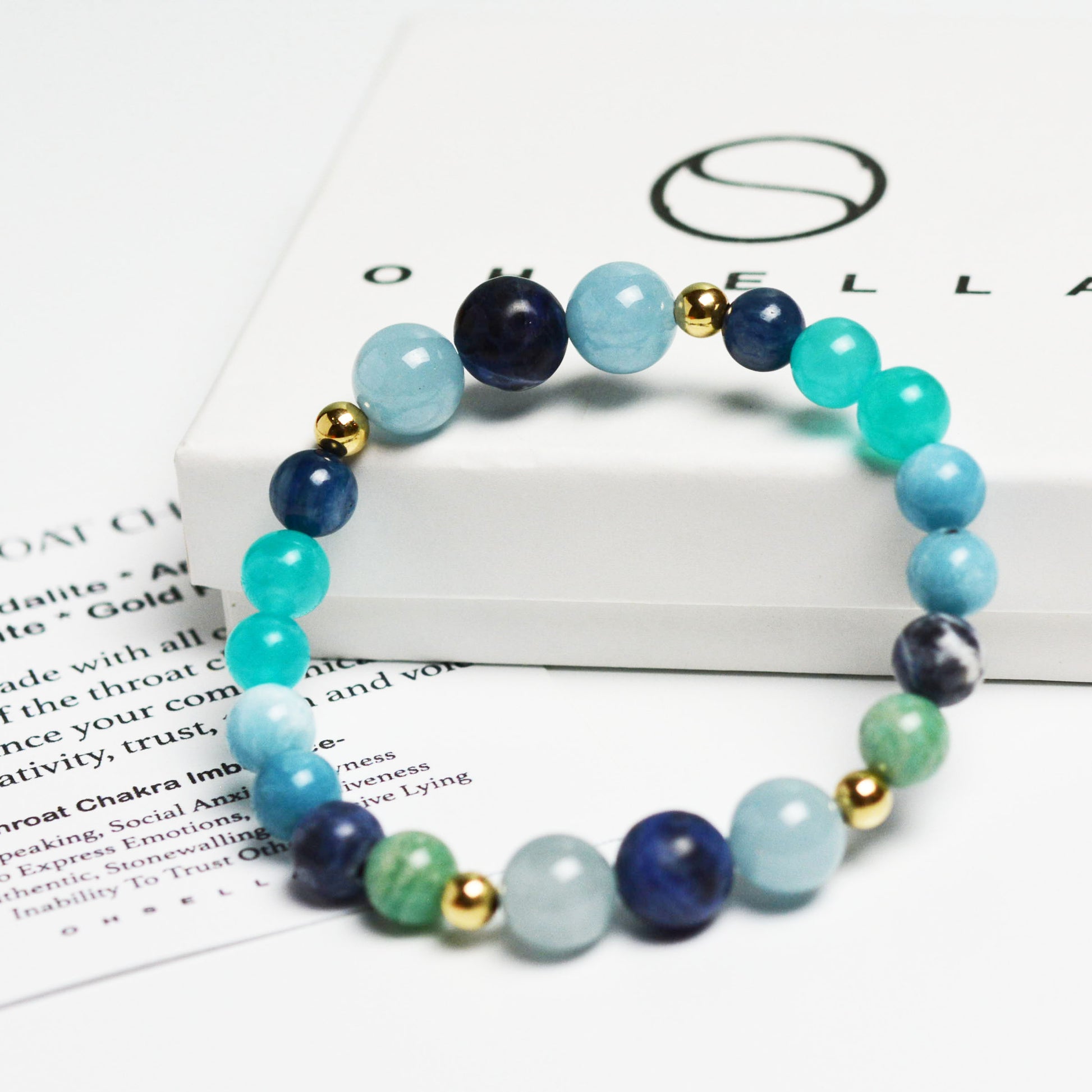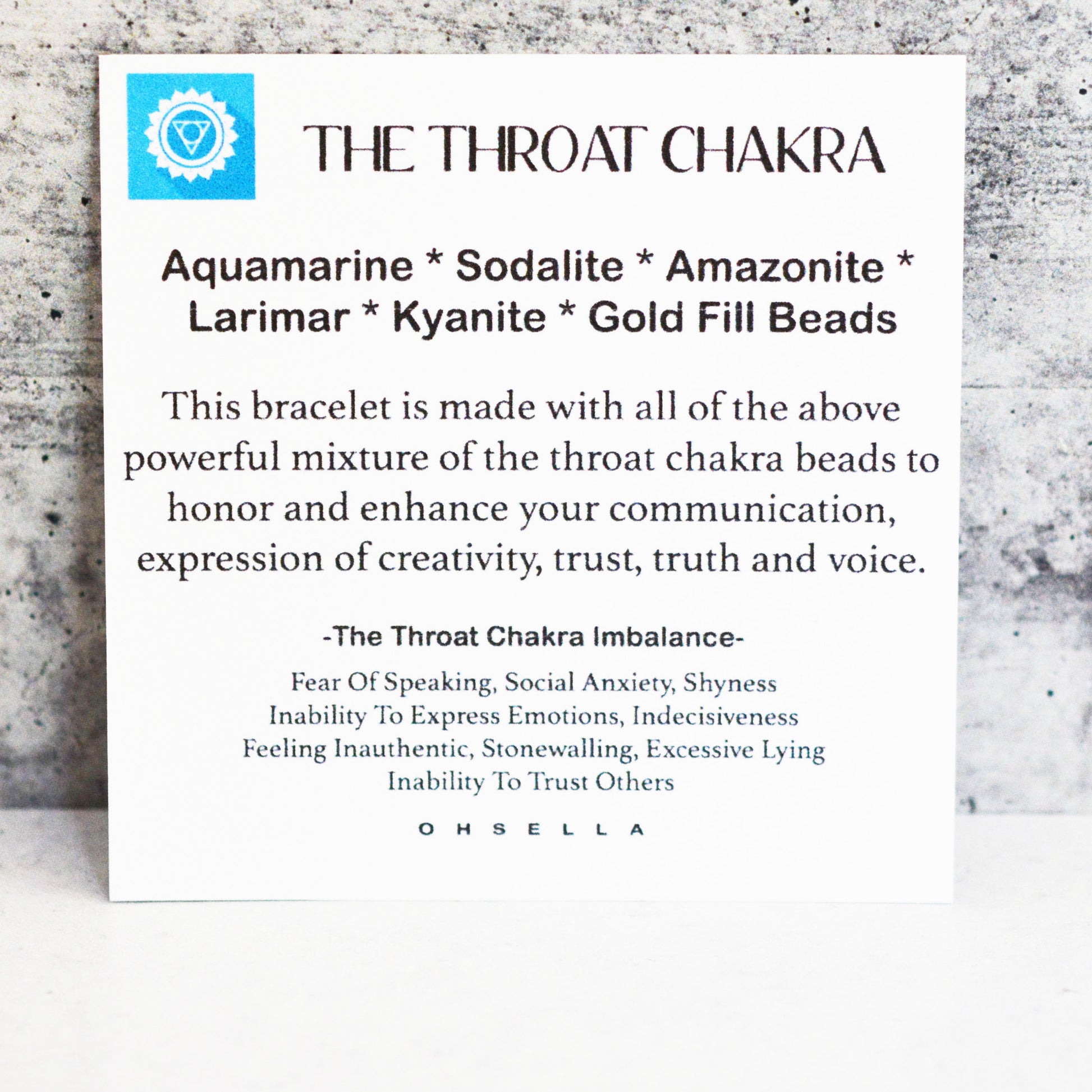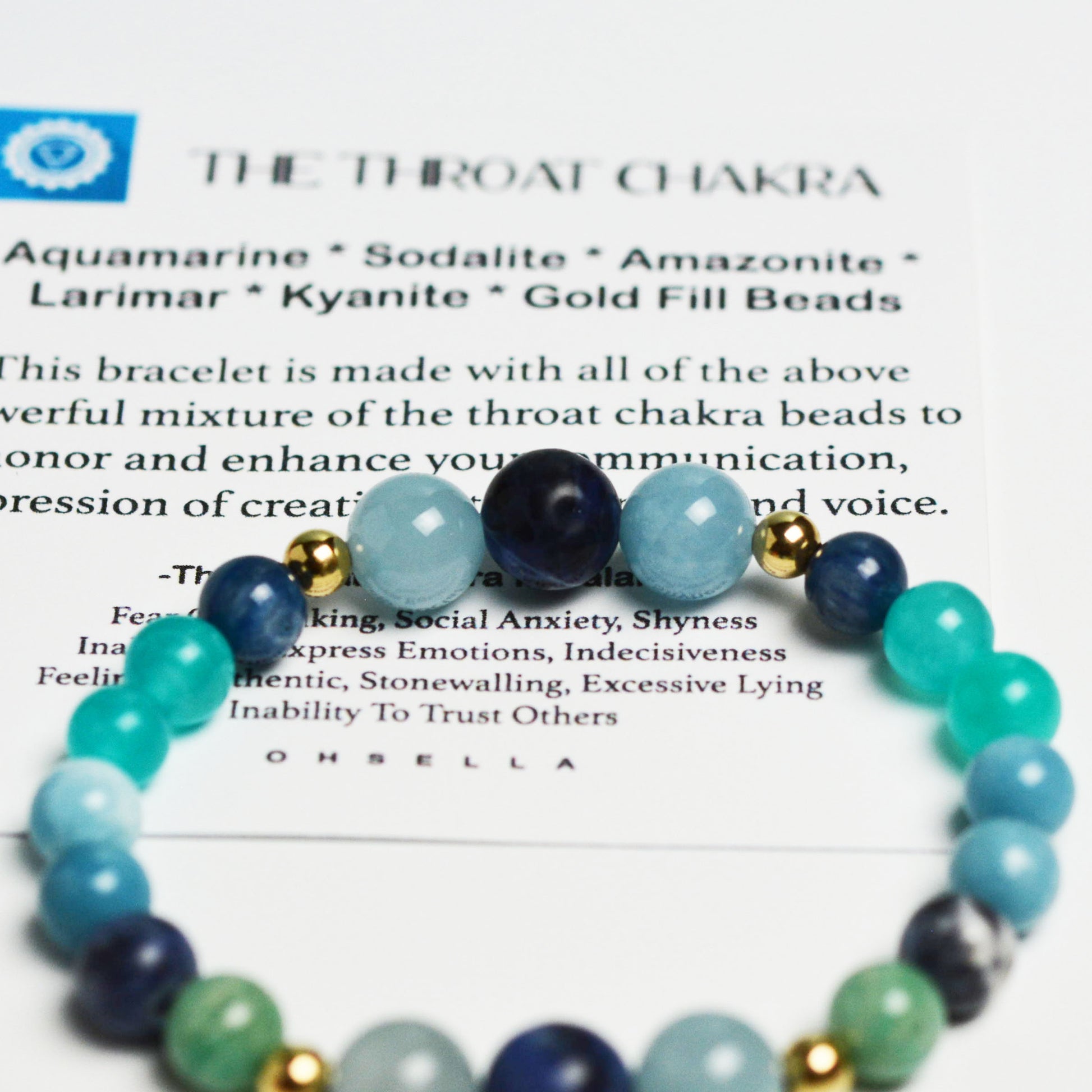 The Throat Chakra bracelet contains Aquamarine, Sodalite, Amazonite, Larimar, Kyanite & Gold Fill Beads. This bracelet is made with a powerful mixture of the throat chakra beads to honor and enhance your communication, expression of creativity, trust, truth and voice.