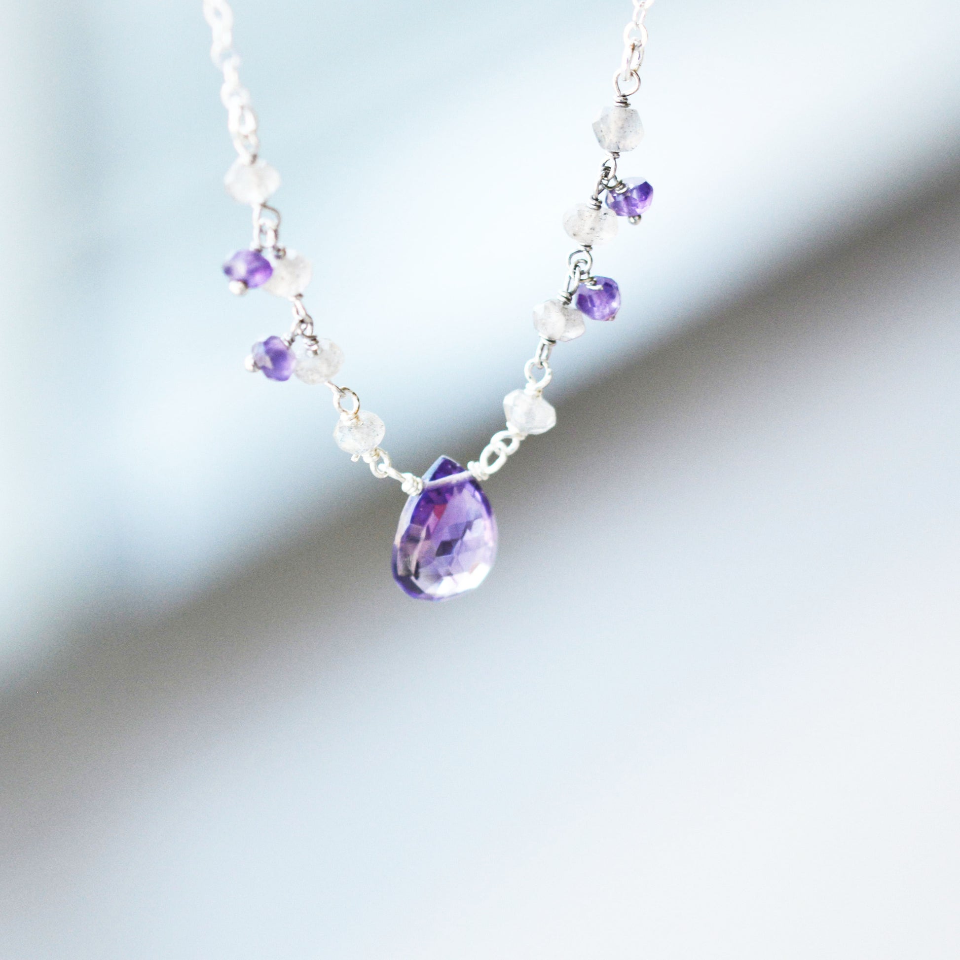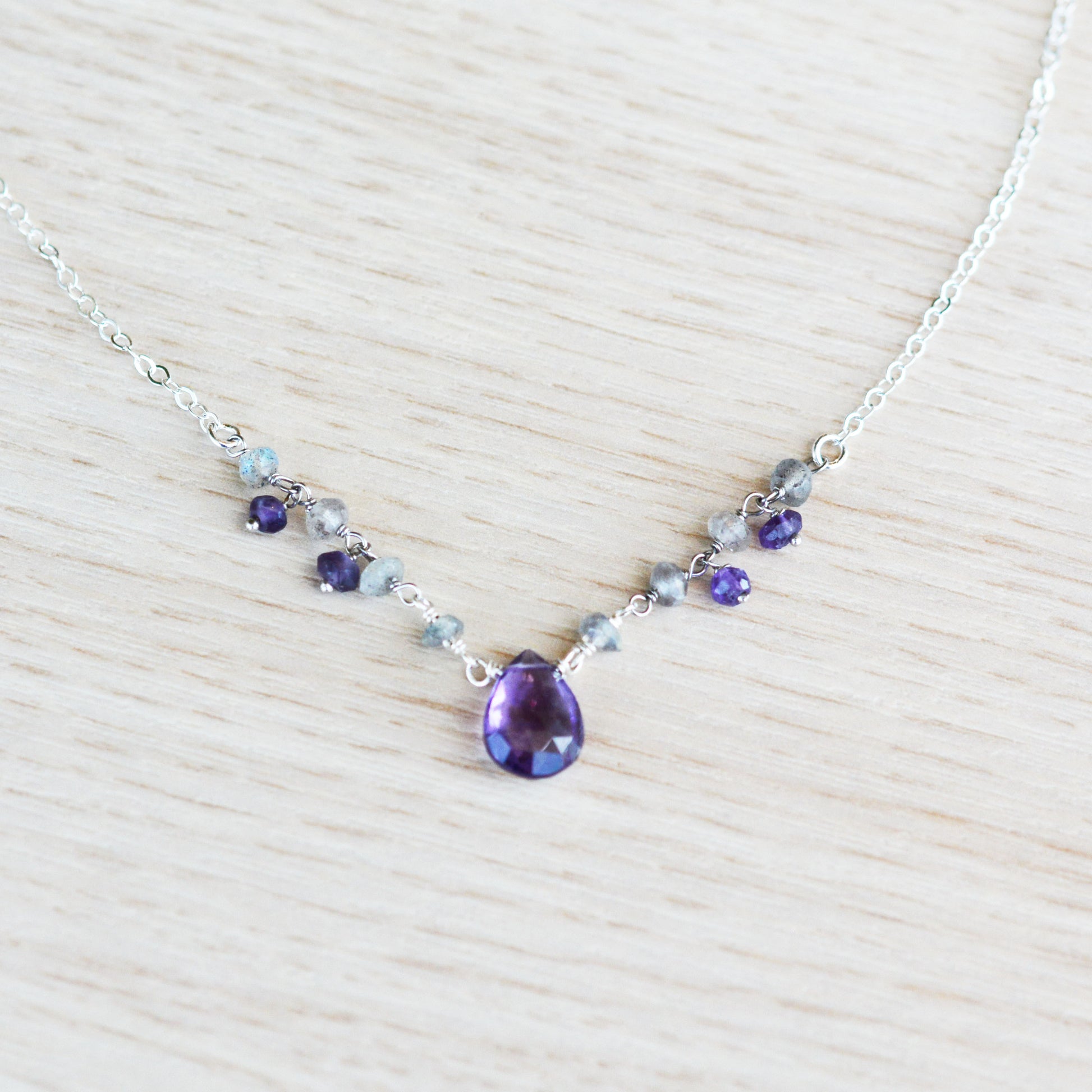 Bursting with color purple of amethyst and rainbow gray color of labradorite intermingle together to make this necklace impossible to miss and also make it great to wear from day or night.