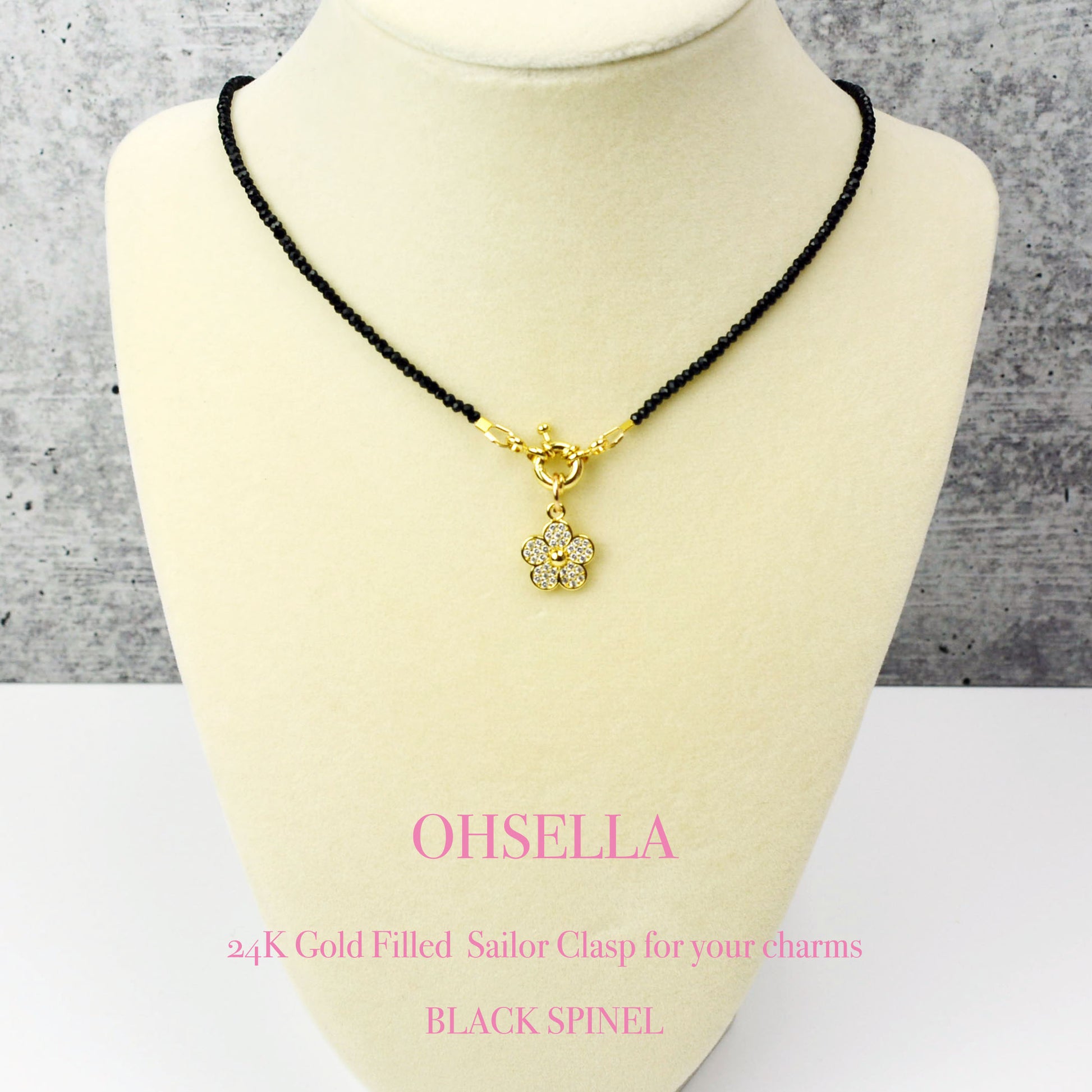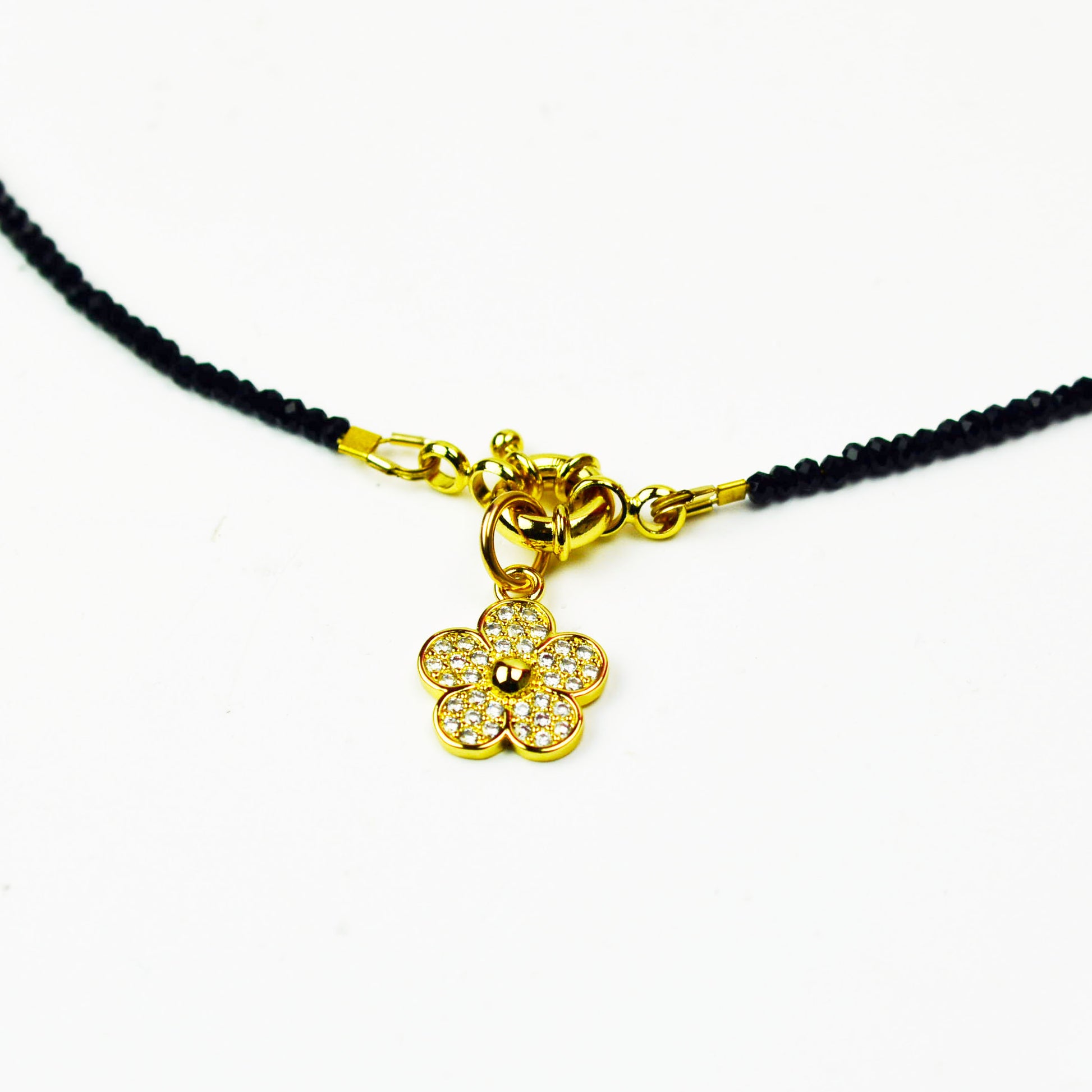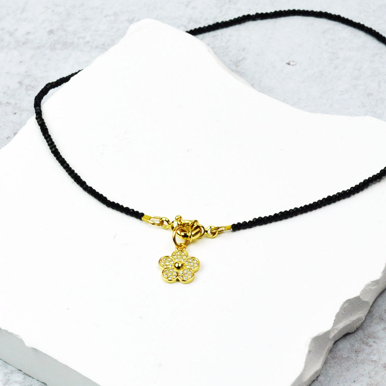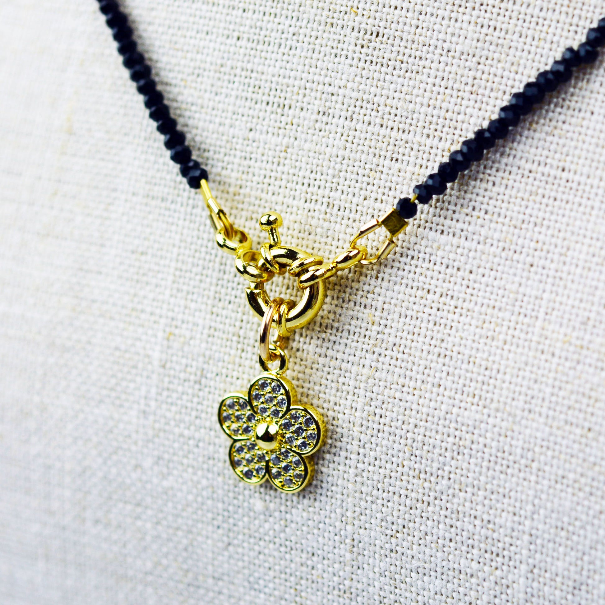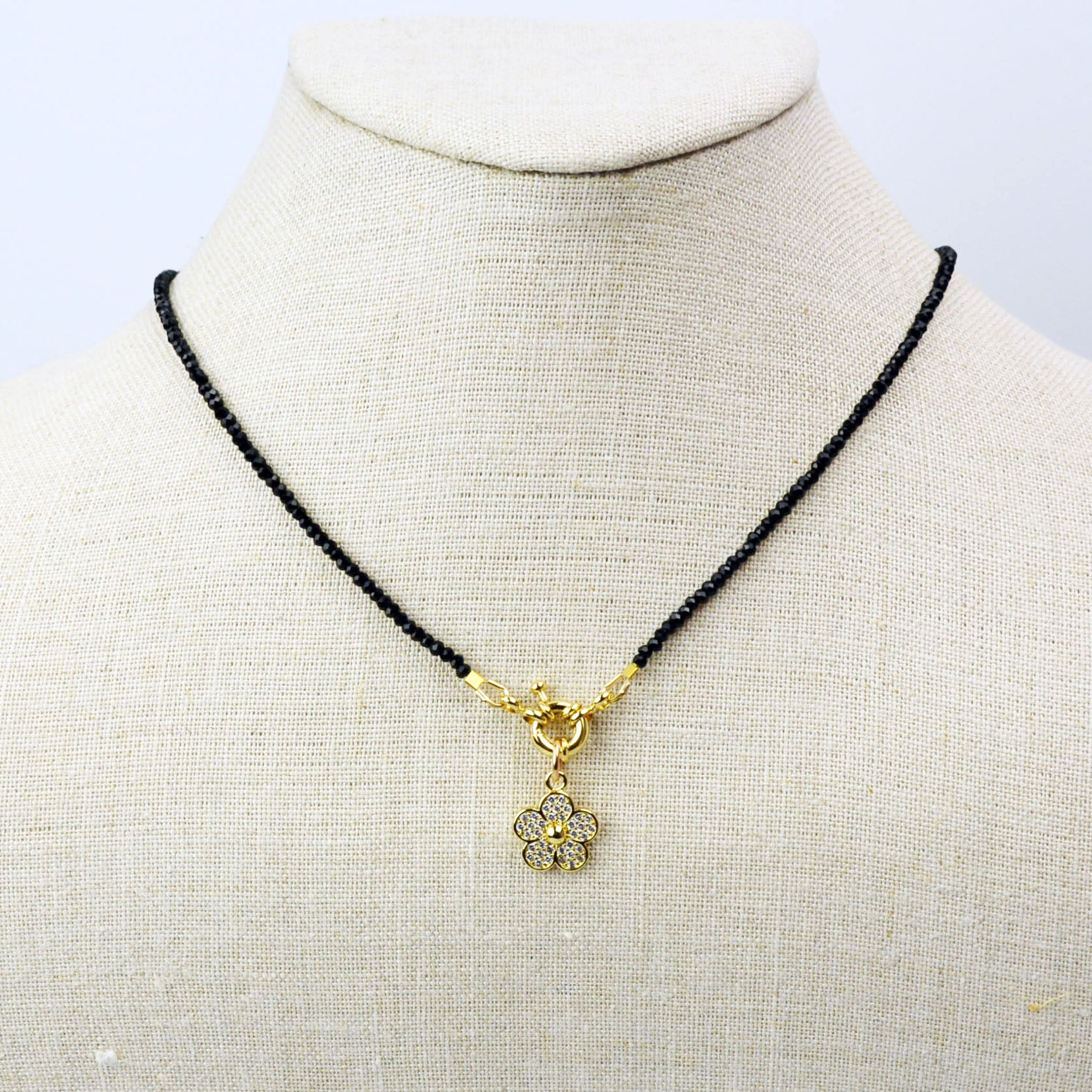 Delicate Black Spinel Beaded Necklace with Sailor Clasp with Sparkly Daisy Charm