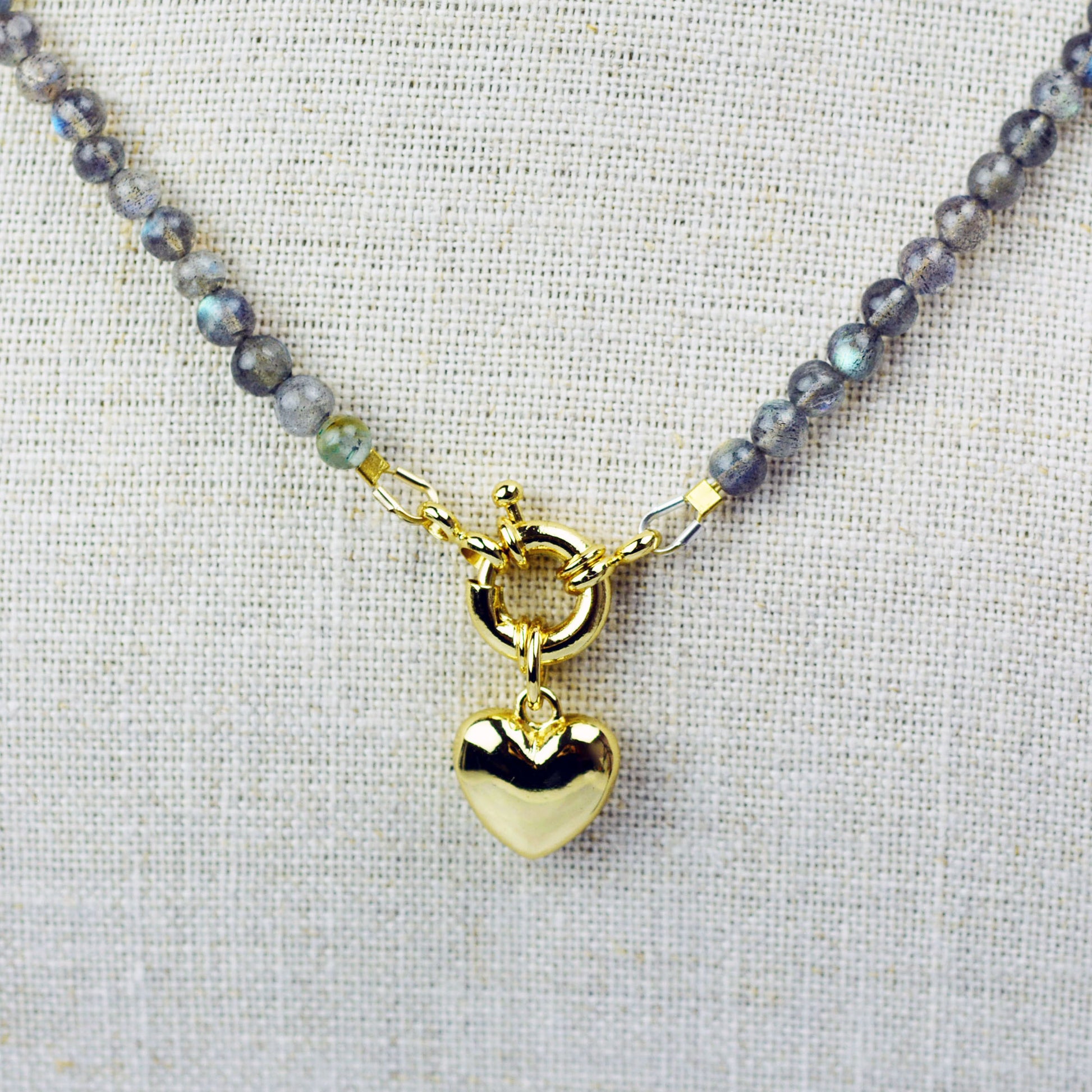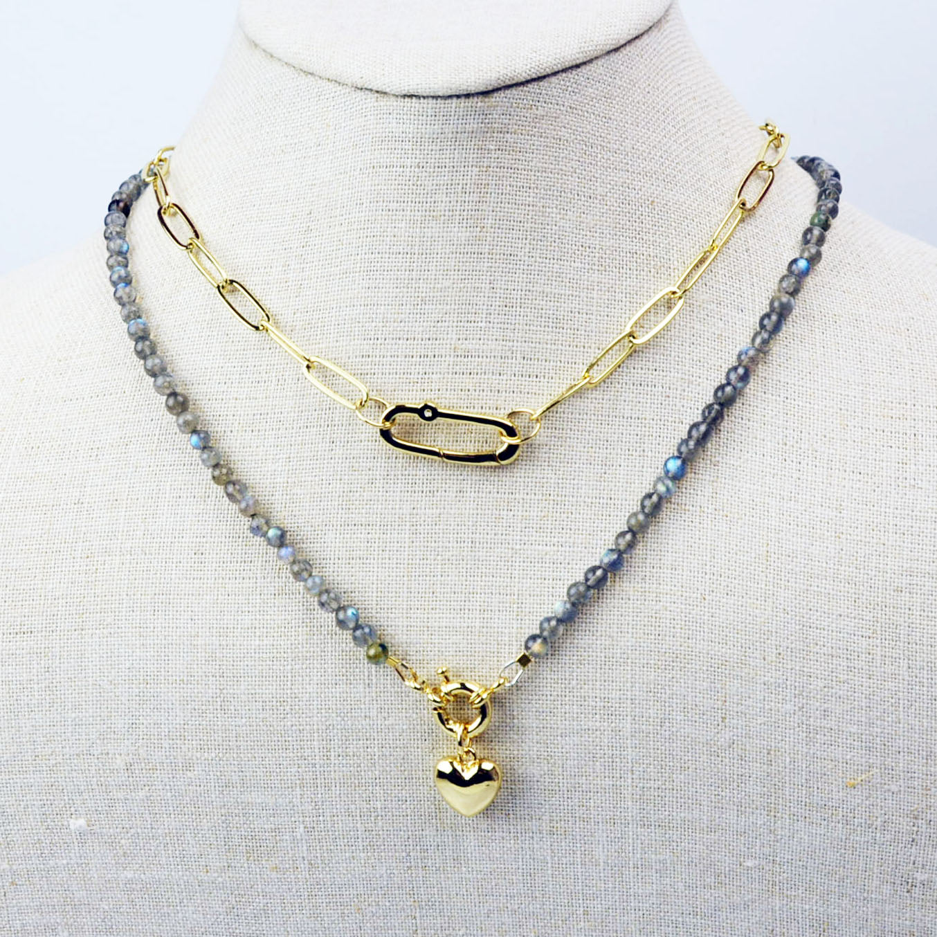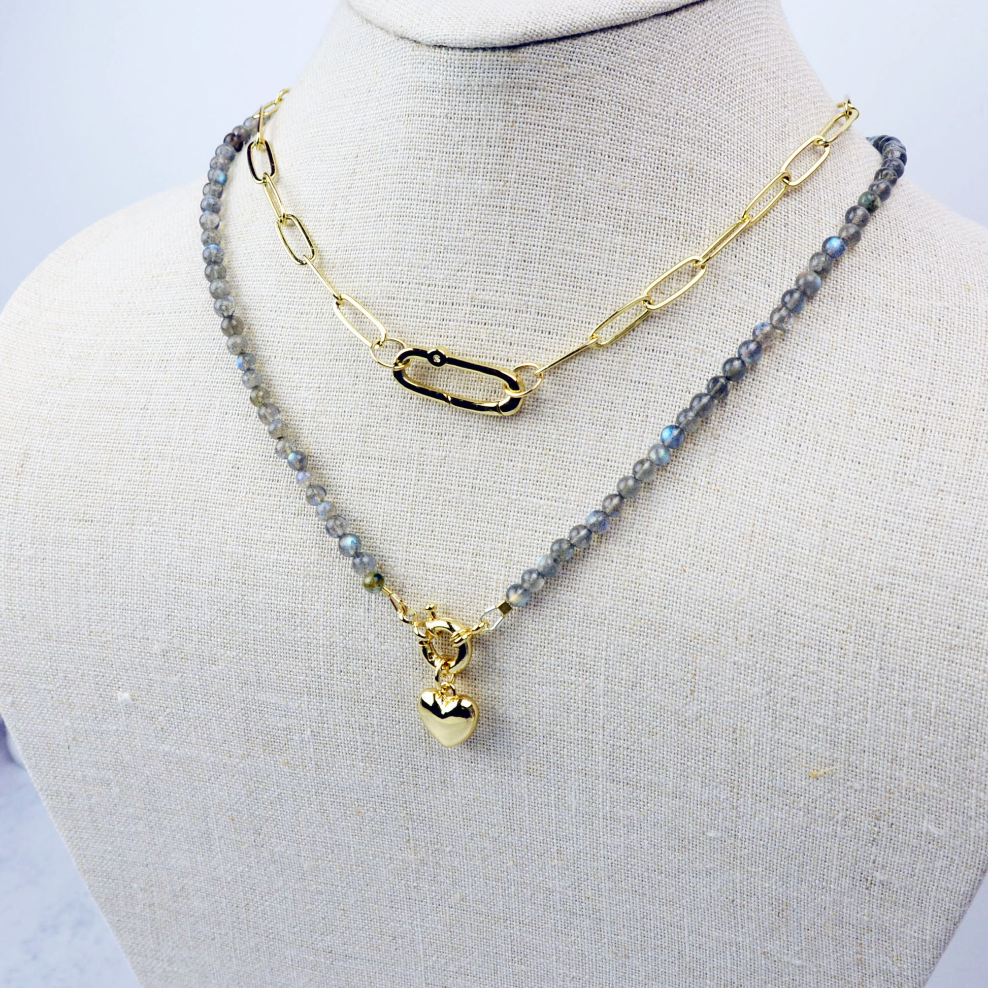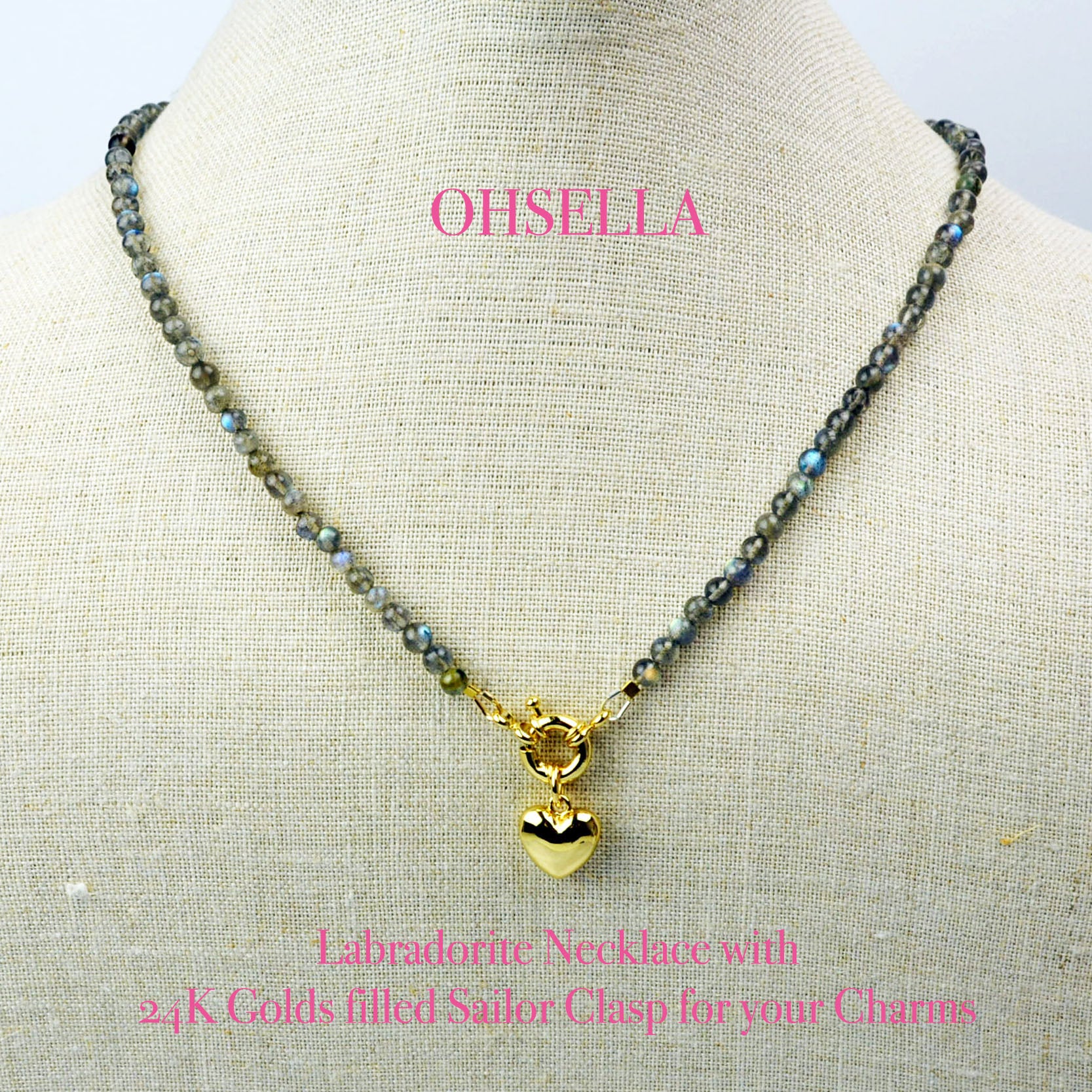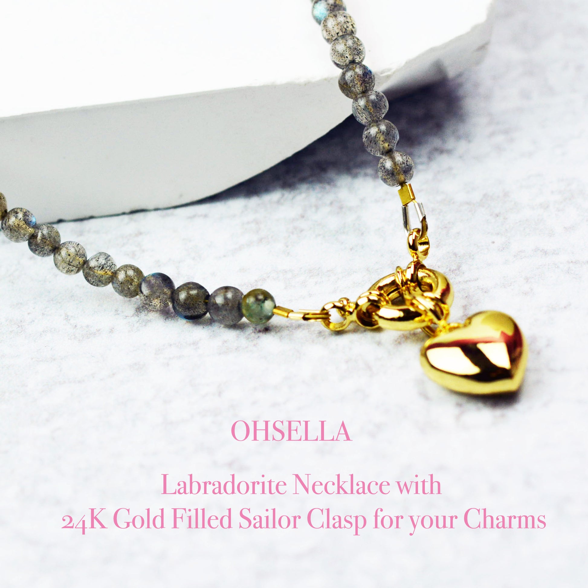 Introducing our Delicate Labradorite Beaded Necklace with 24K Gold-Filled Tailor Clasp for Charms—a refined, hand-crafted piece that combines elegance with versatility. Each iridescent labradorite bead catches the light, reflecting mesmerizing shades of blue, green, and gray. Designed with meticulous attention to detail, this necklace features a high-quality, 24K gold-filled clasp that allows you to easily add or switch charms, personalizing your look.