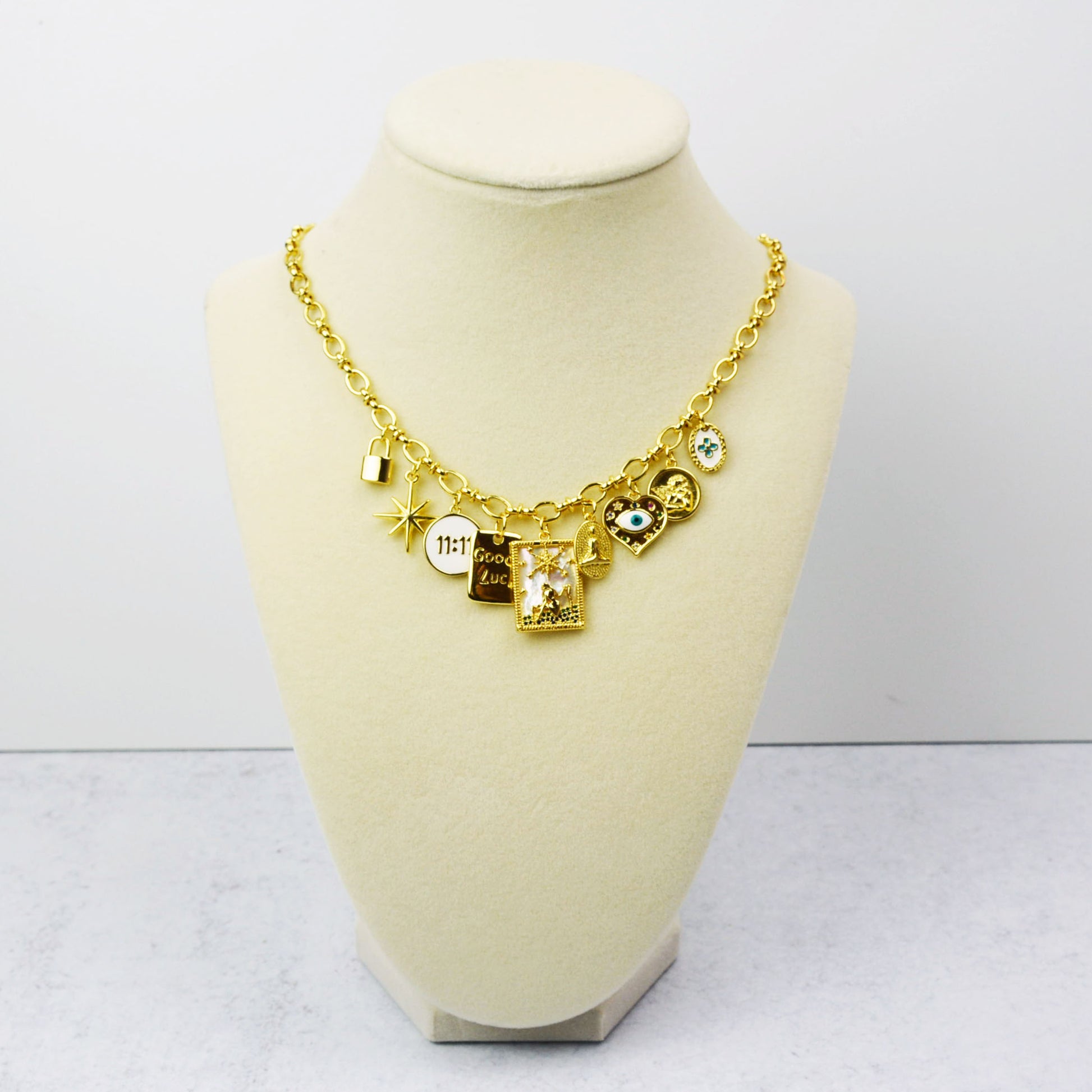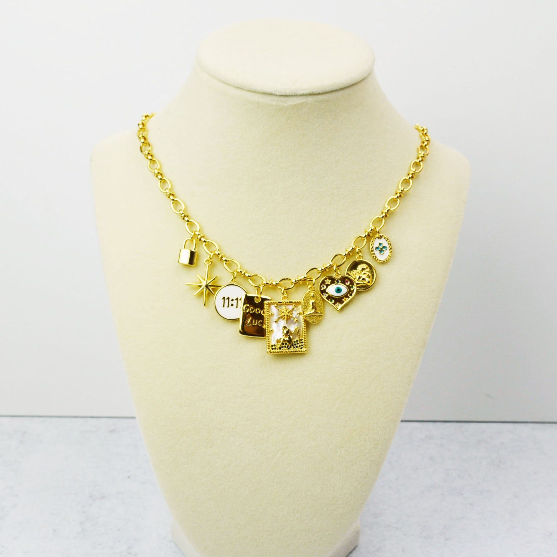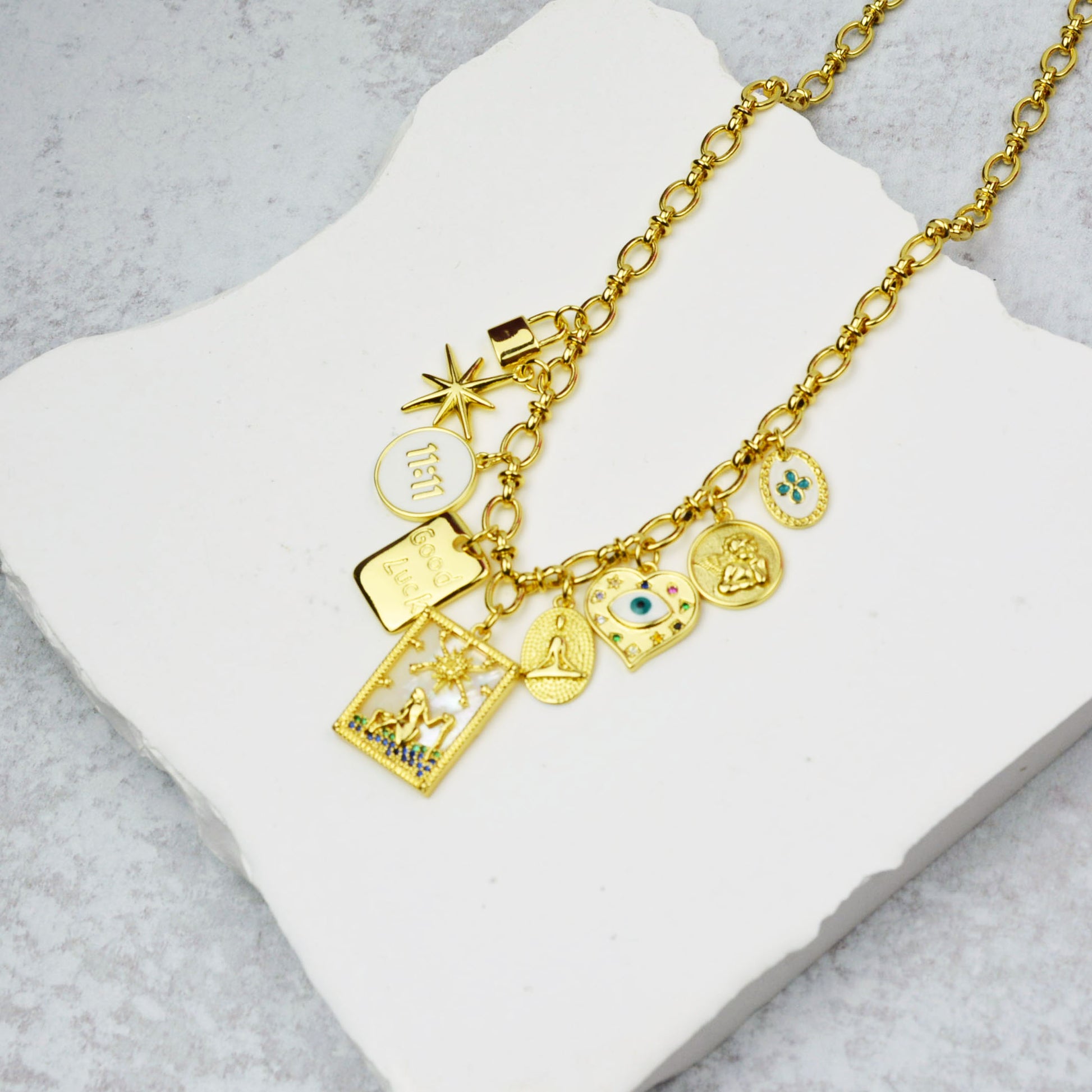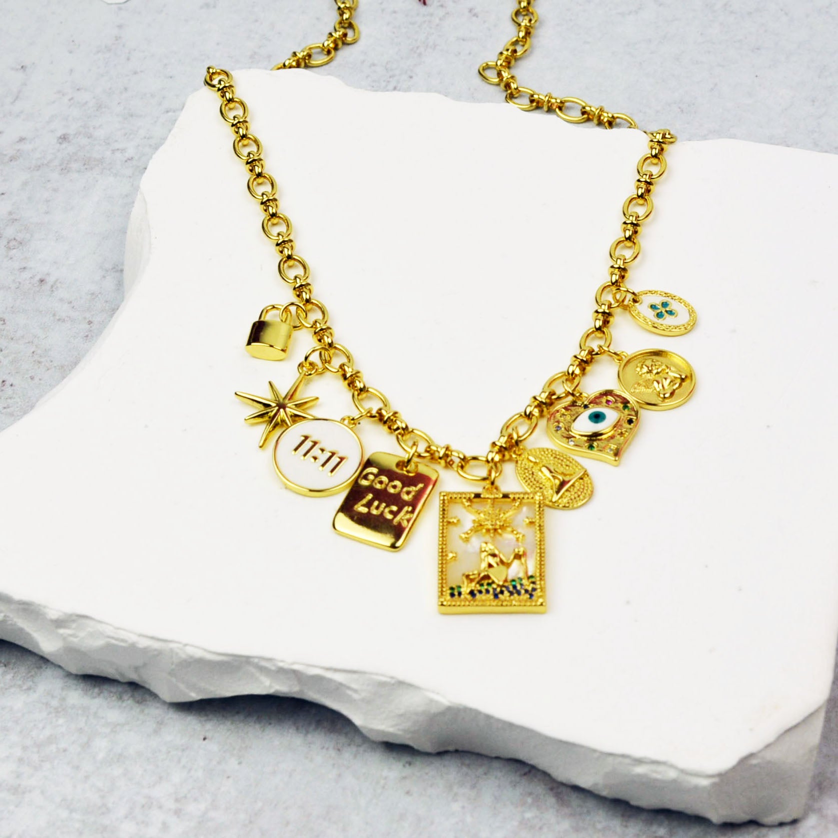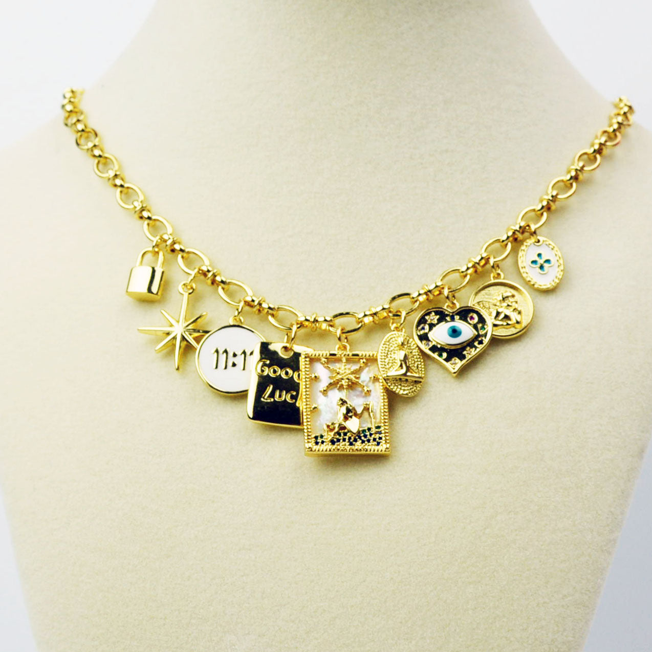 The charms consist from Sun tarot card to evil eyes, 11:11 lucky numbers, lucky clover and etc....