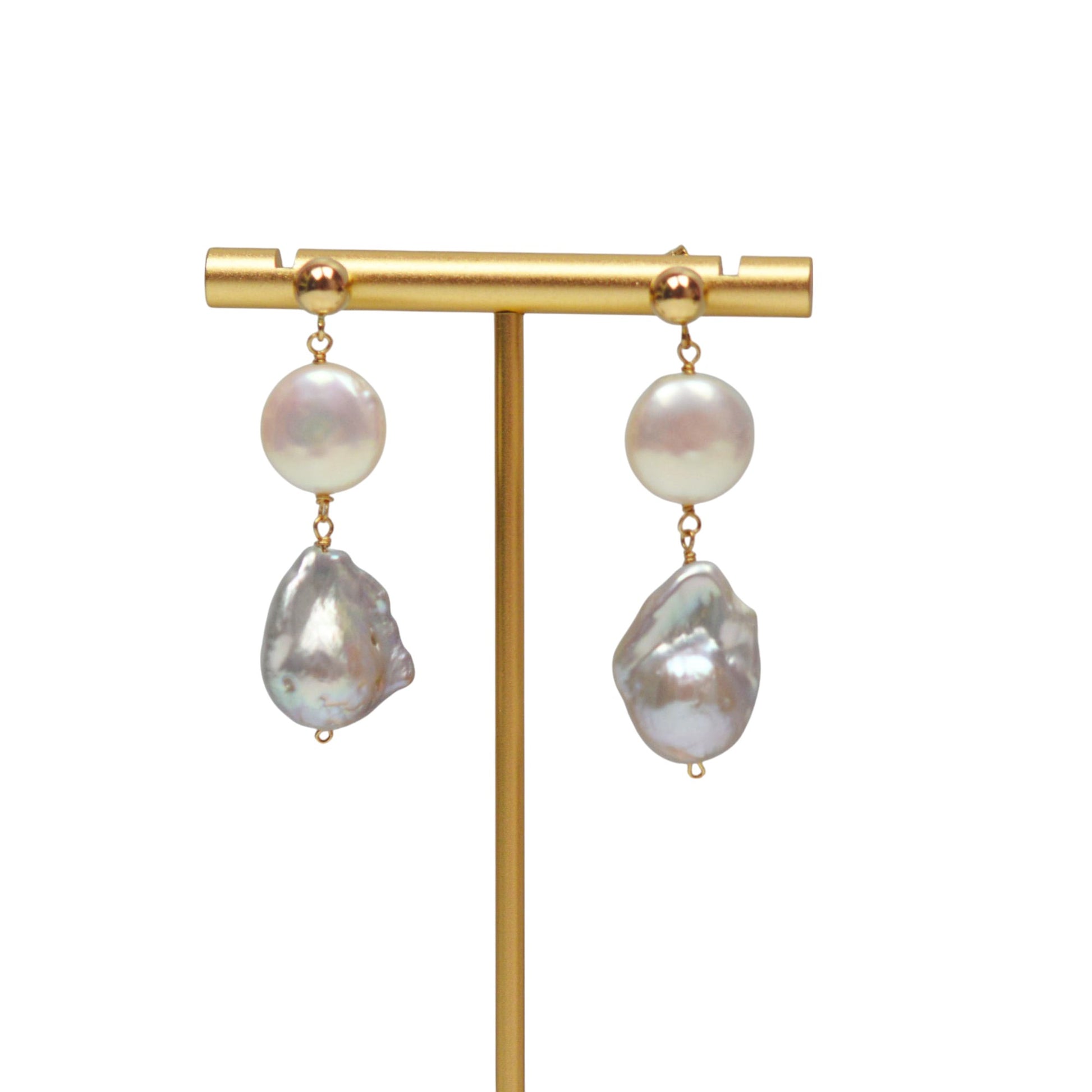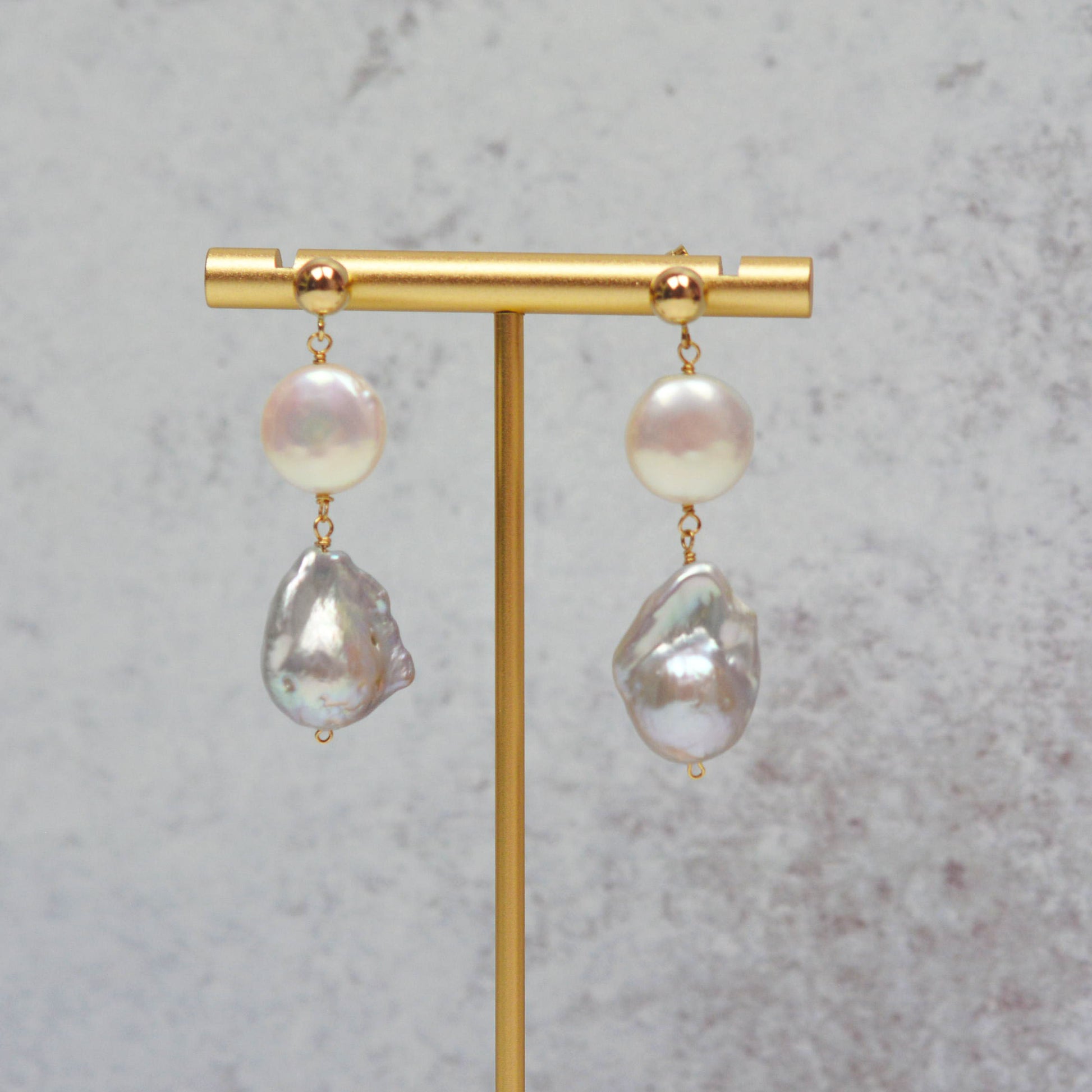 Indulge in the timeless elegance of these exquisite handmade dangle earrings, meticulously crafted to captivate with every sway. Each earring features a harmonious fusion of top-quality grey baroque pearls and lustrous coin pearls.