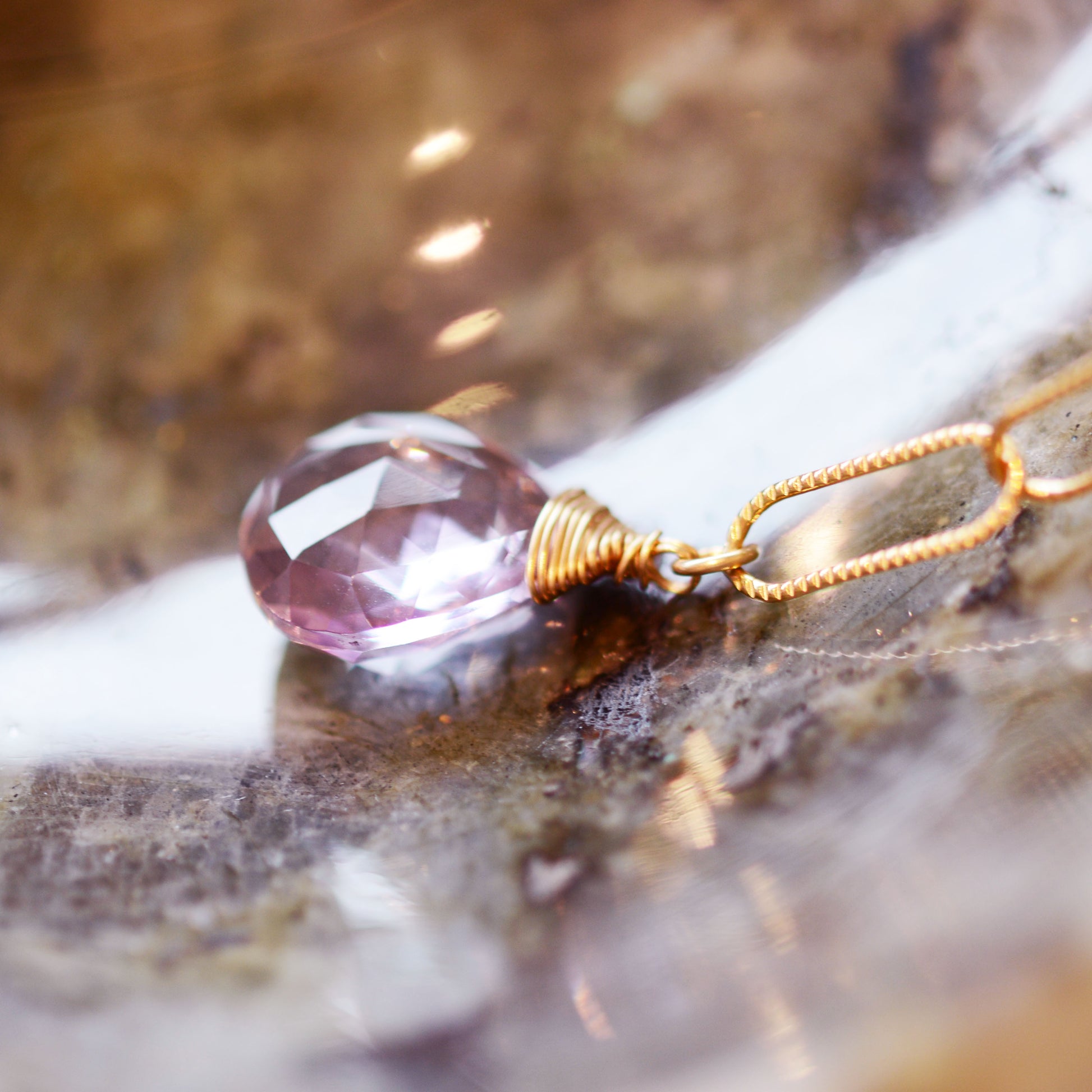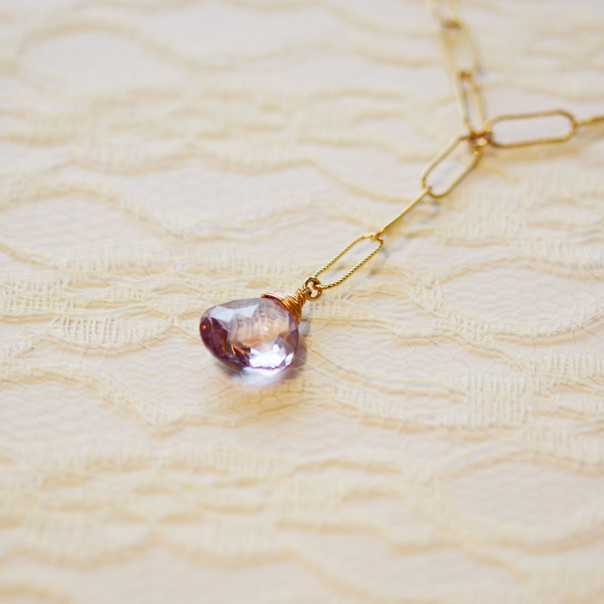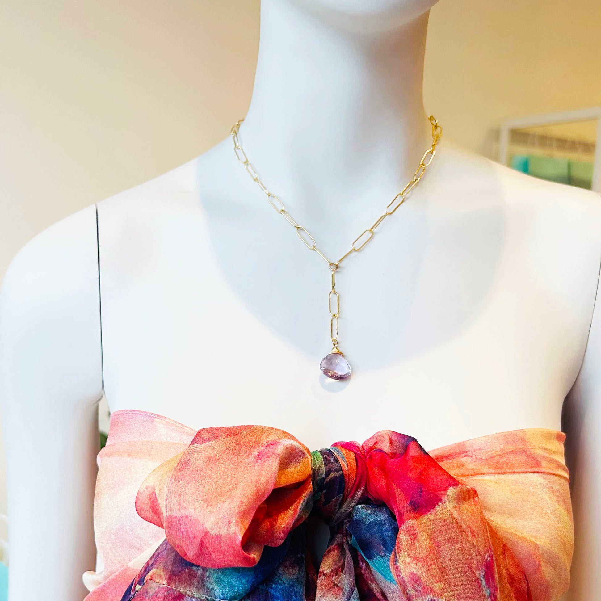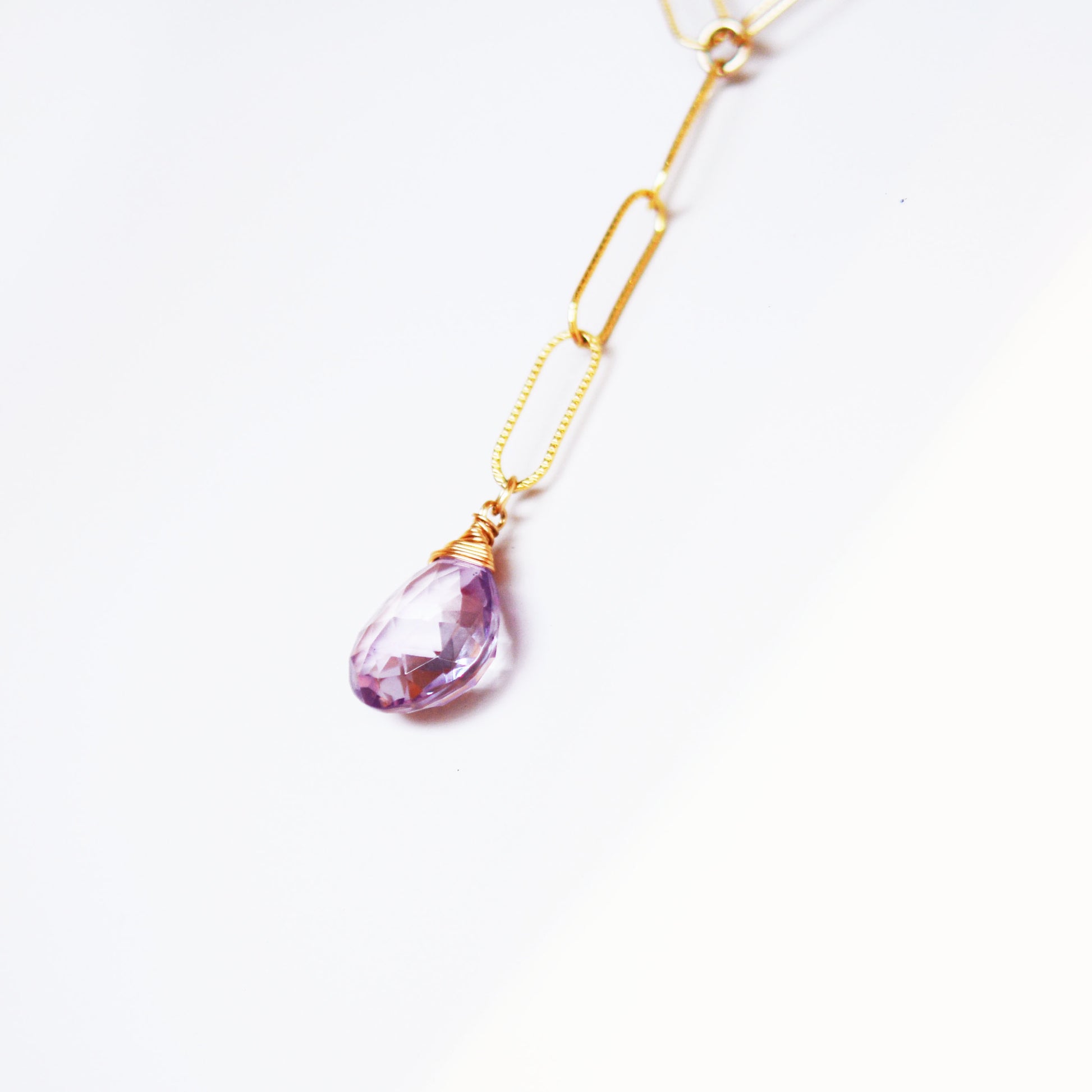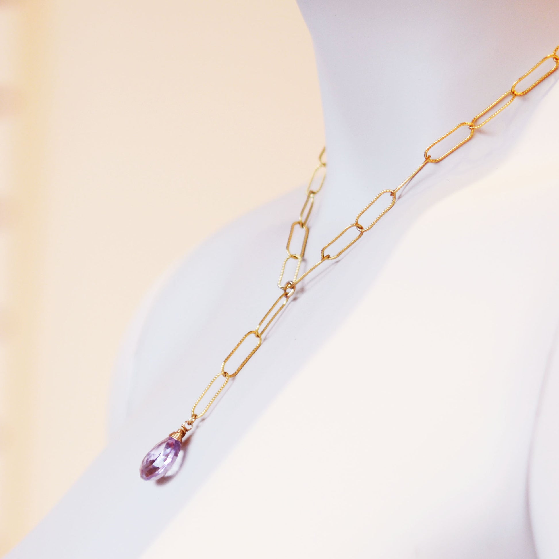 Introducing the epitome of elegance and sophistication - the lariat necklace featuring a popular 18K gold fill paper clip chain adorned with a top-quality and rare Lilac amethyst drop. Crafted with exquisite attention to detail, this necklace seamlessly blends contemporary design with timeless beauty.