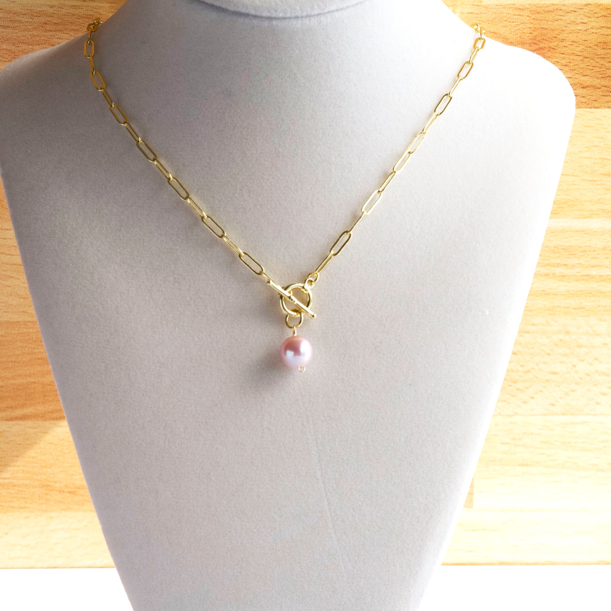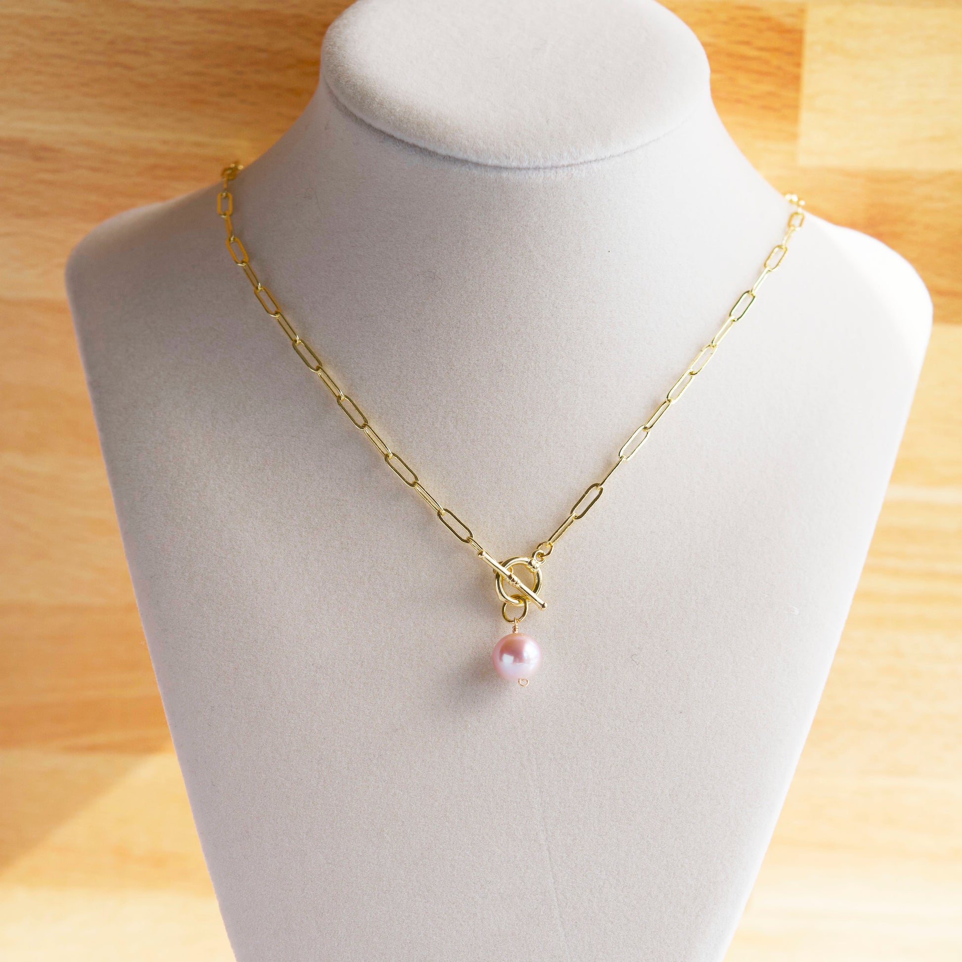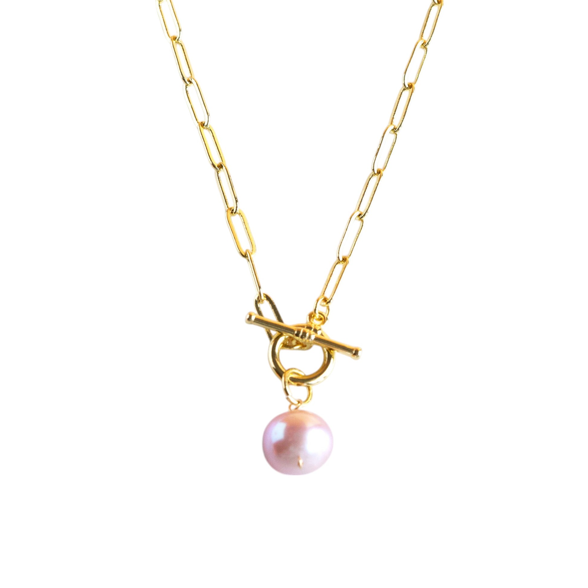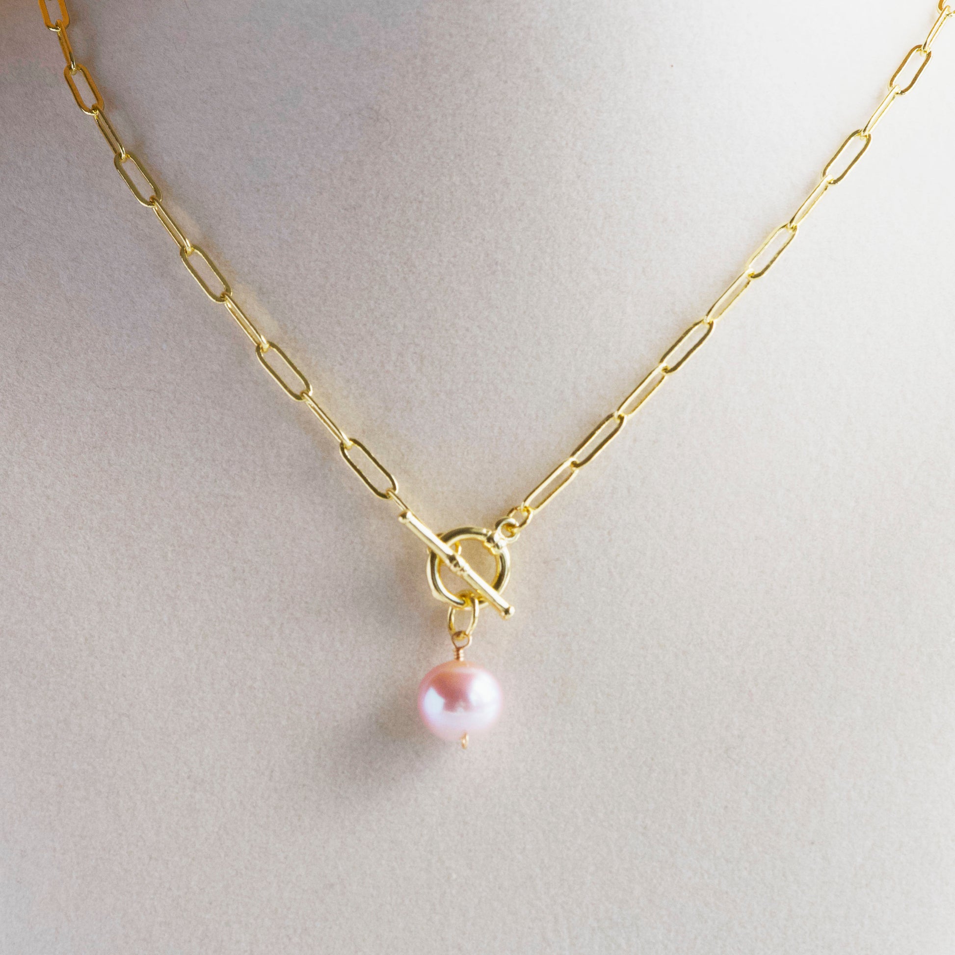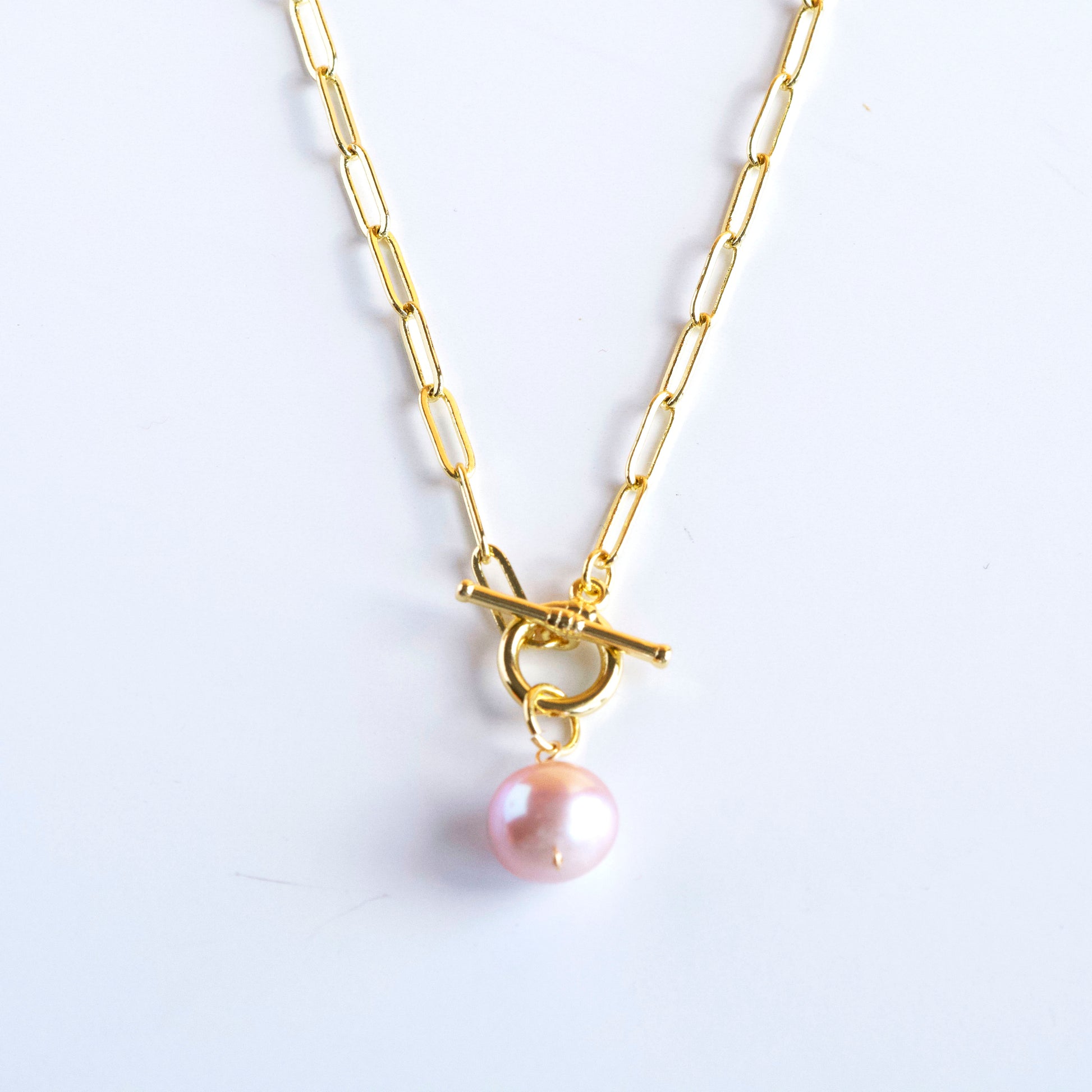 Limited Edition 18K Gold-Fill Paperclip Necklace with Rare Pink Freshwater Pearl & Toggle Clasp