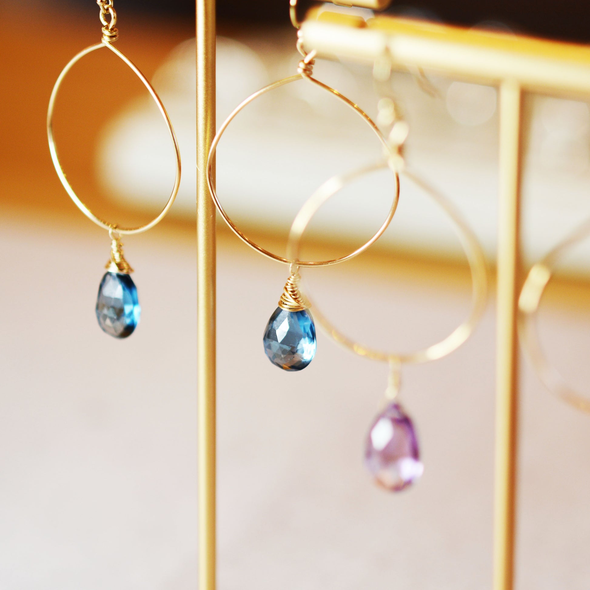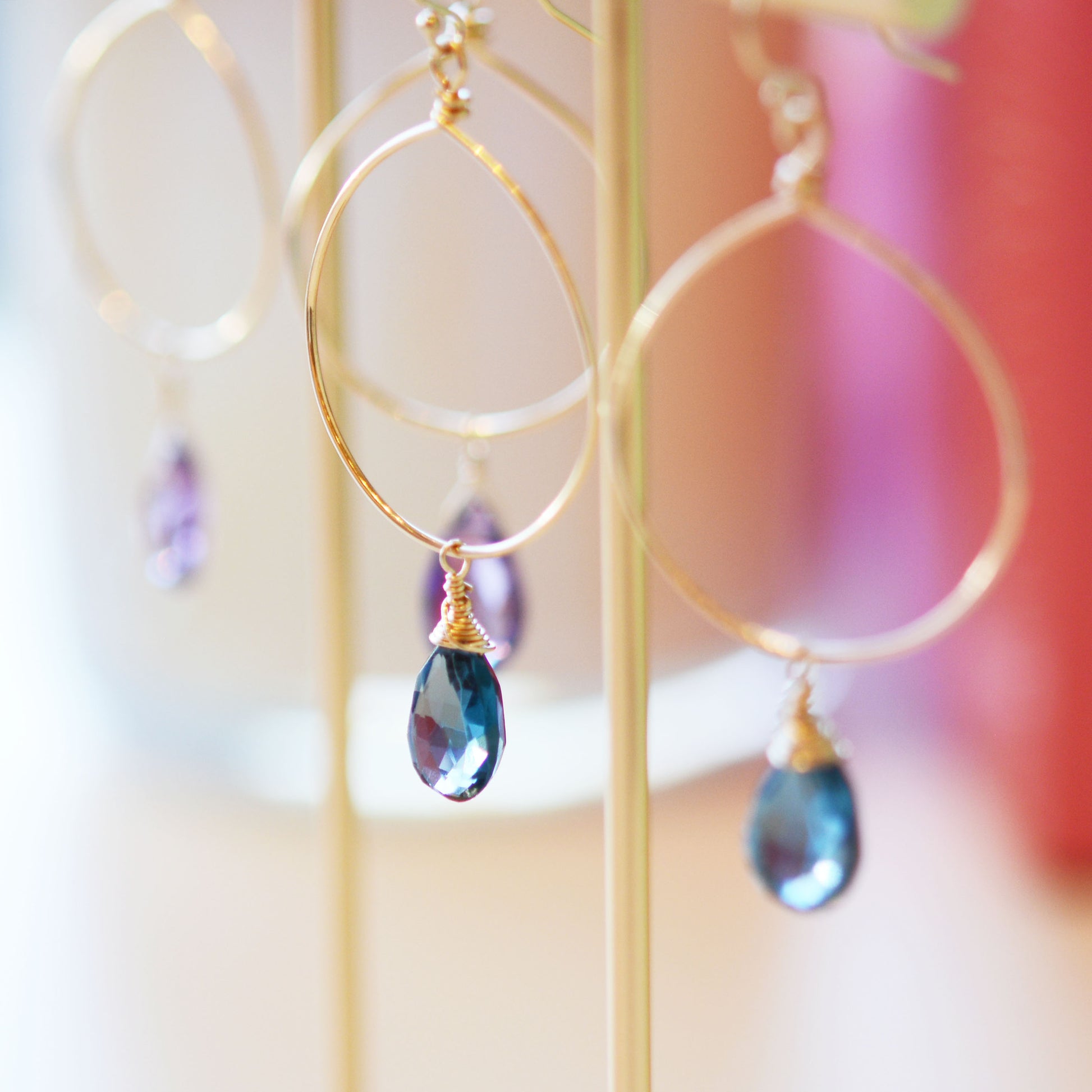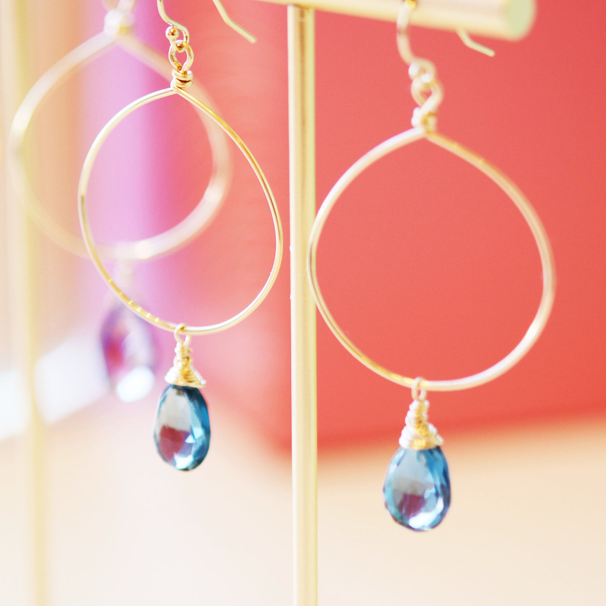 Each hoop is delicately formed with 18K Gold Fill wires , ensuring durability and a luxurious finish that gleams with every movement. The richness of the gold complements the deep, captivating tones of the London Blue gemstones, creating a timeless piece that exudes opulence.