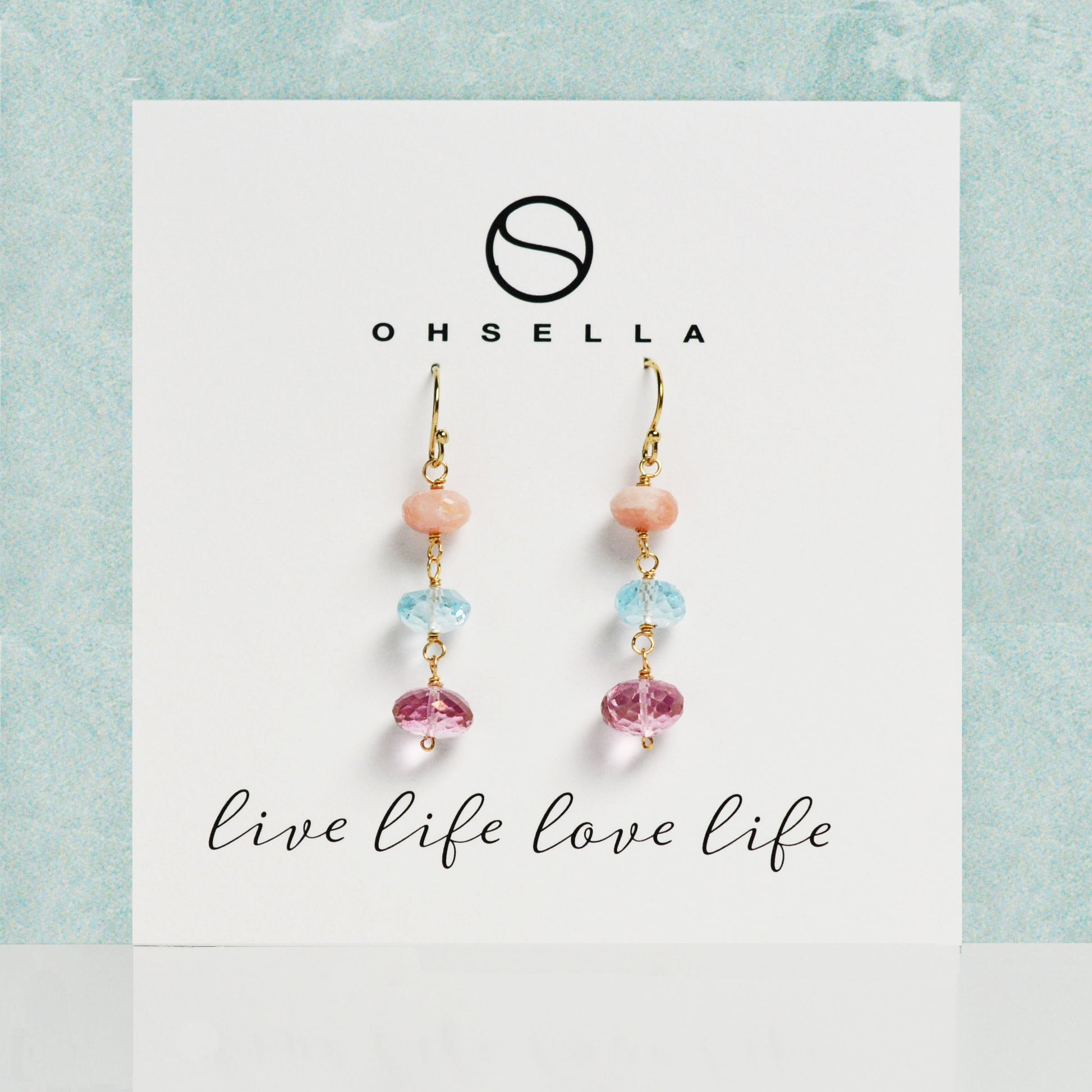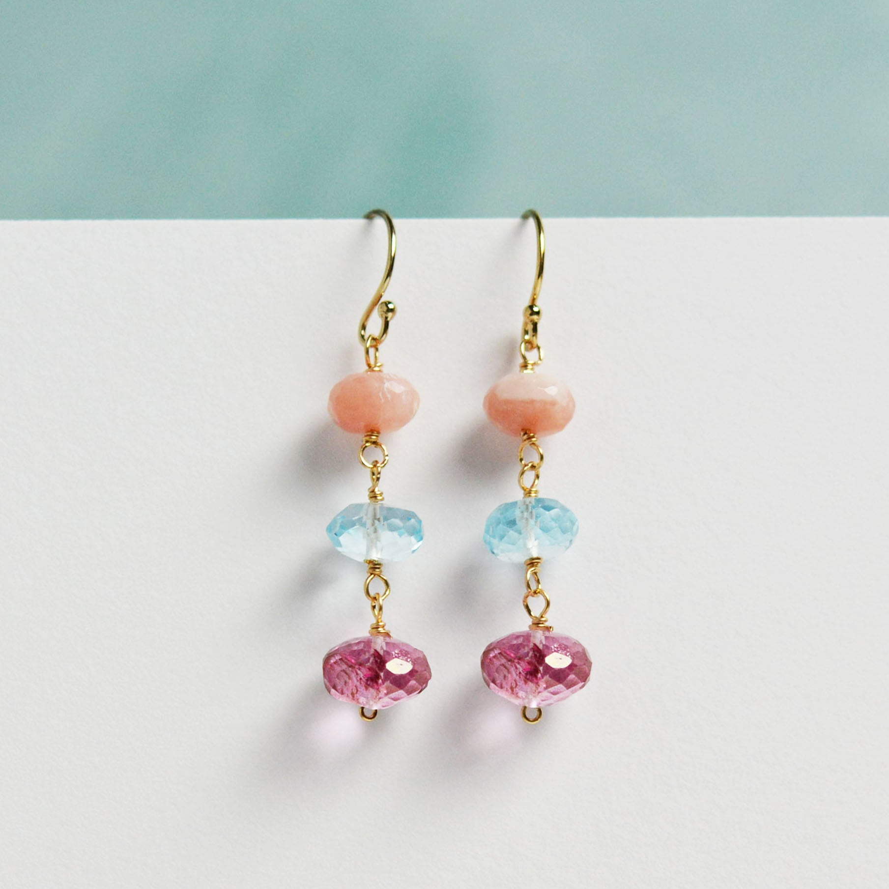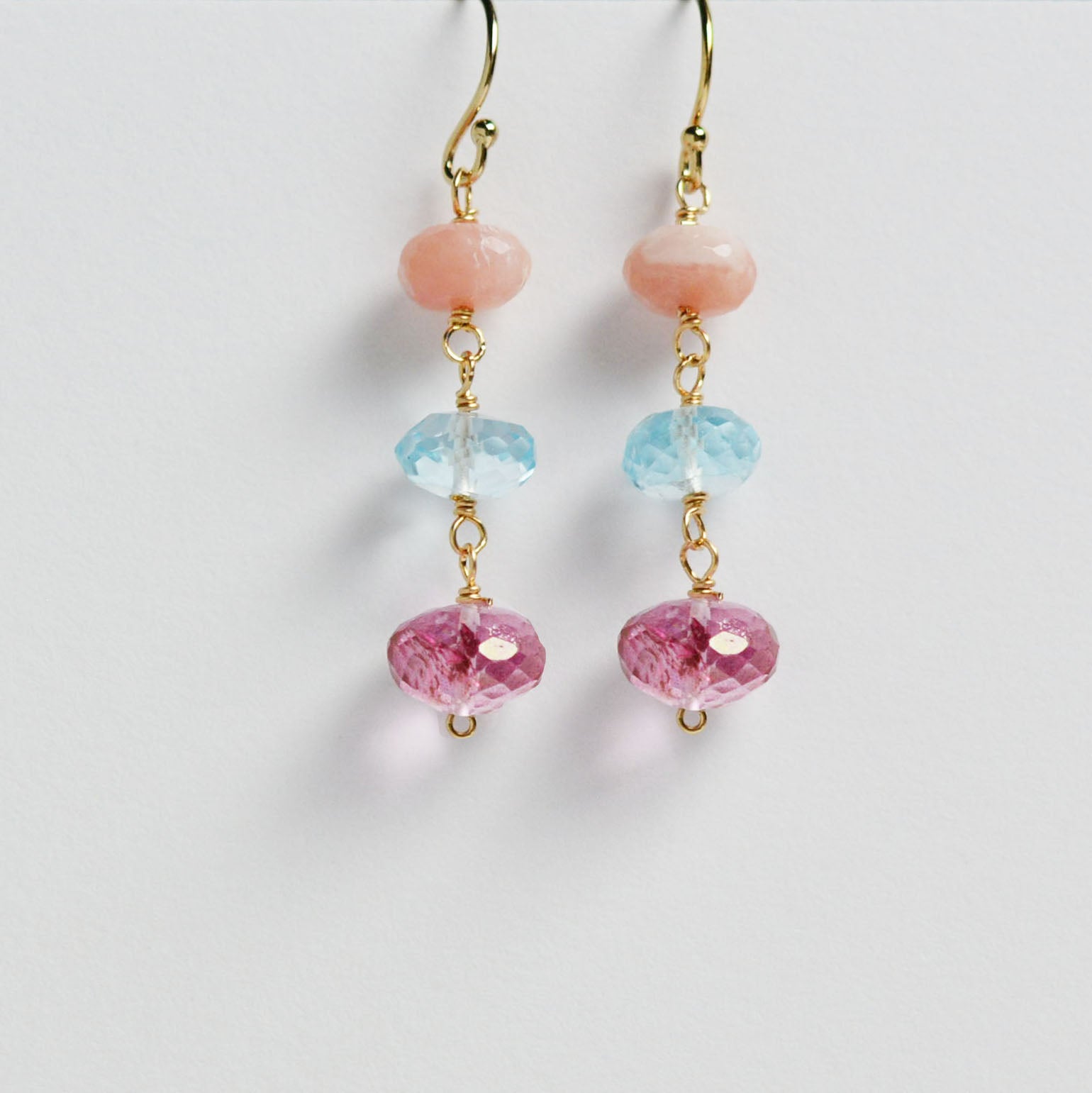 These mixed gemstone dangle earrings are made with top quality Pink Opal, Sky Blue Topaz and Pink Sapphire. They are hand wrapped with gold fill wires. Dainty and stylish, they will give you a punch of sparkly colors to any outfit you wear!