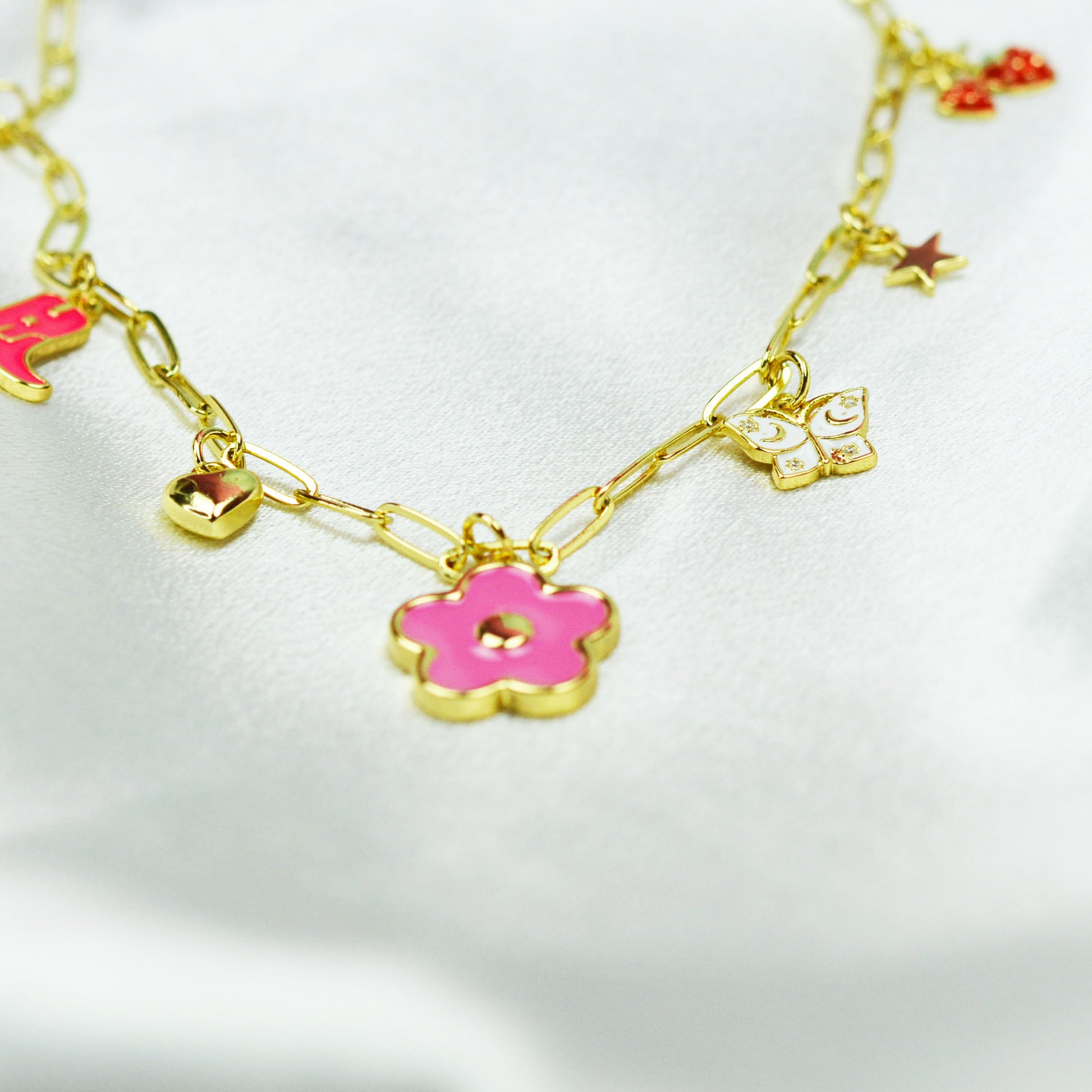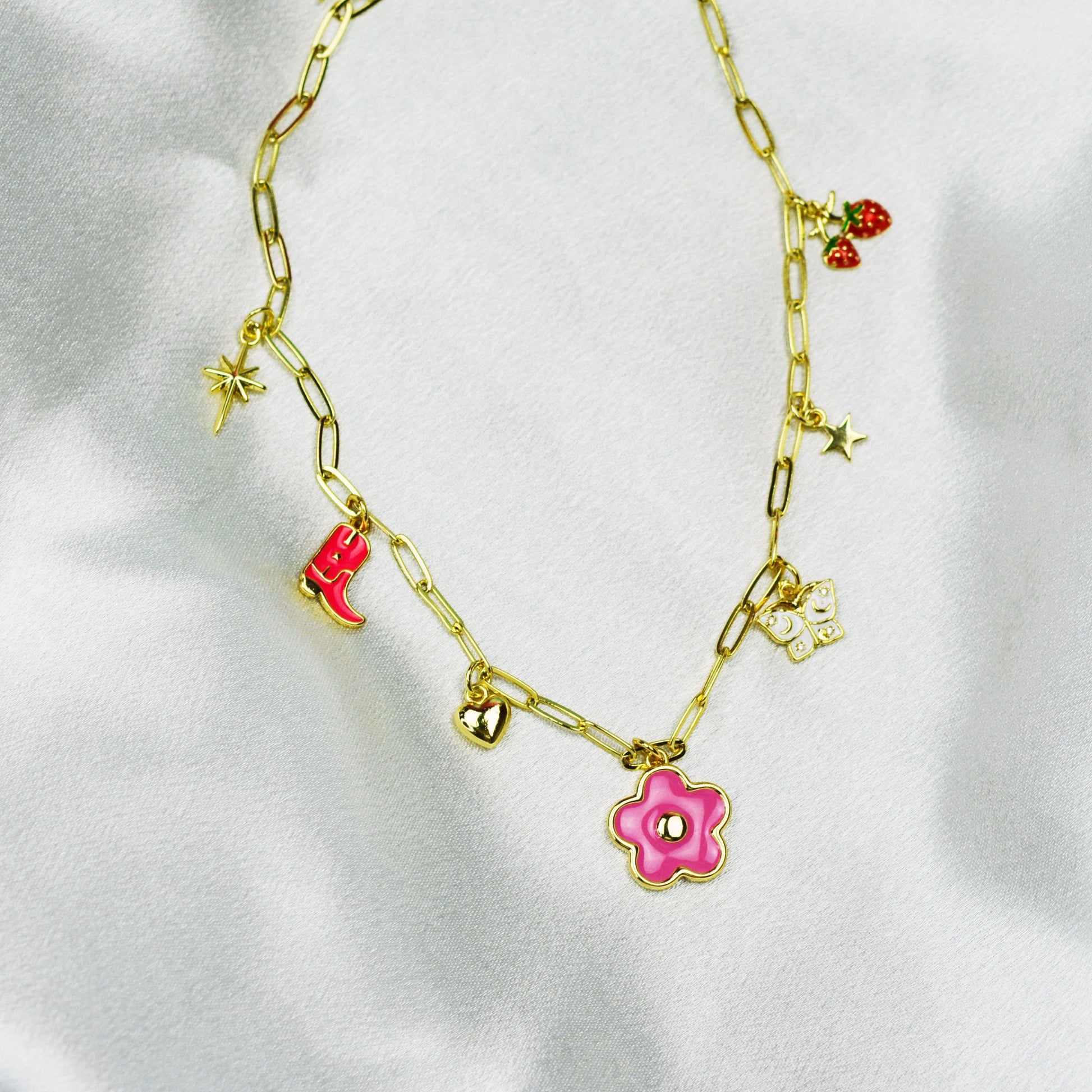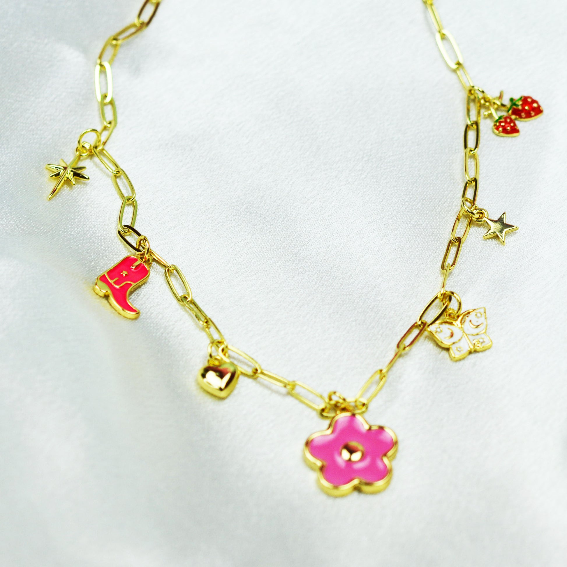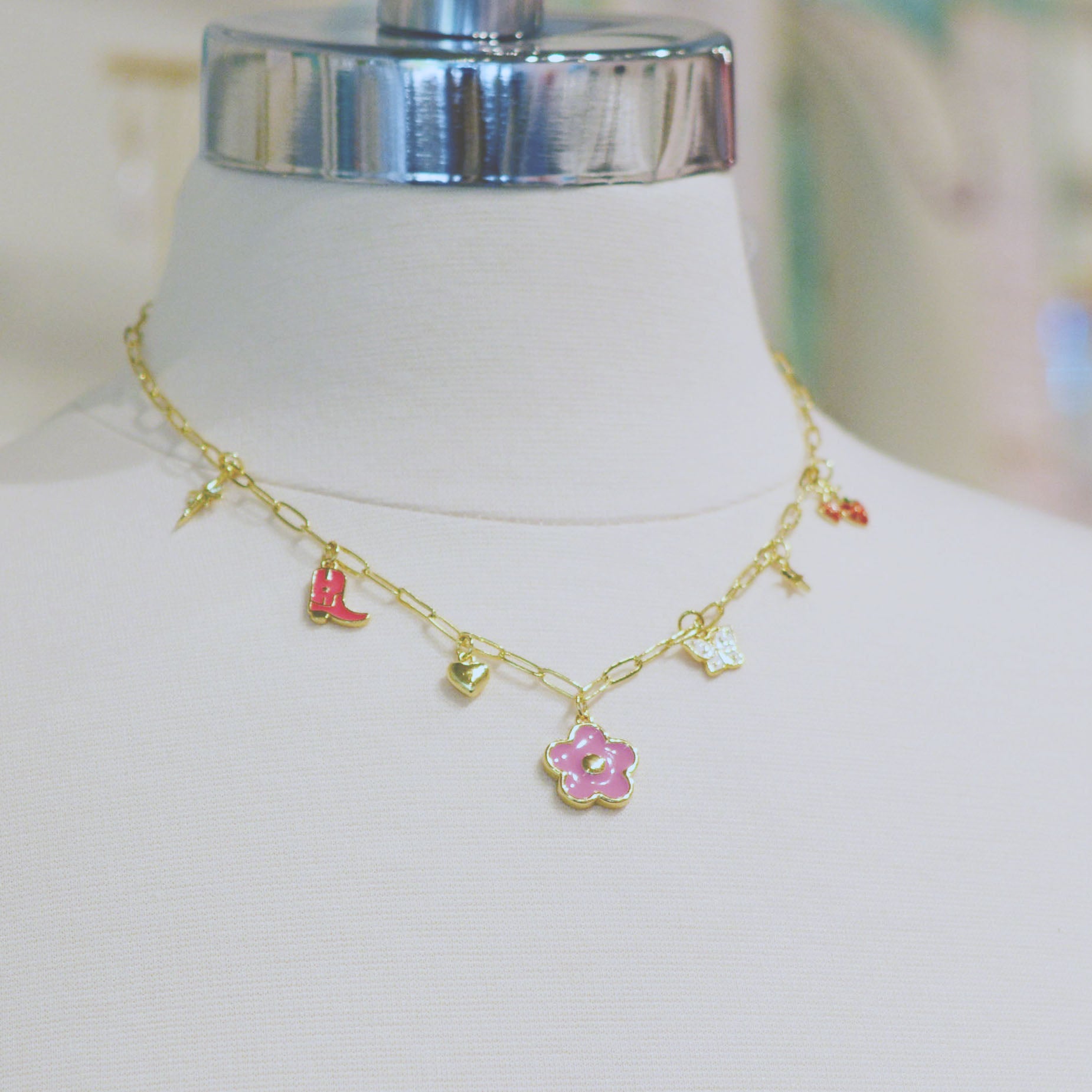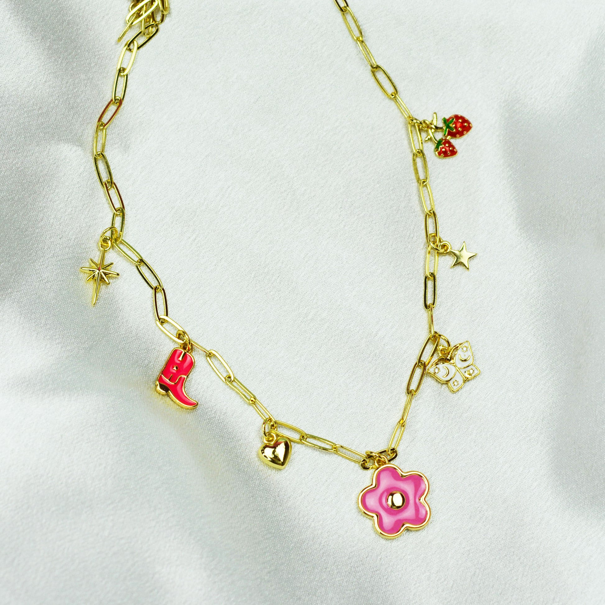 High quality multi charm necklace with a pink daisy, western boot, butterfly, heart, star and strawberry. Very trendy style necklace with 18K gold fill charms and chain.