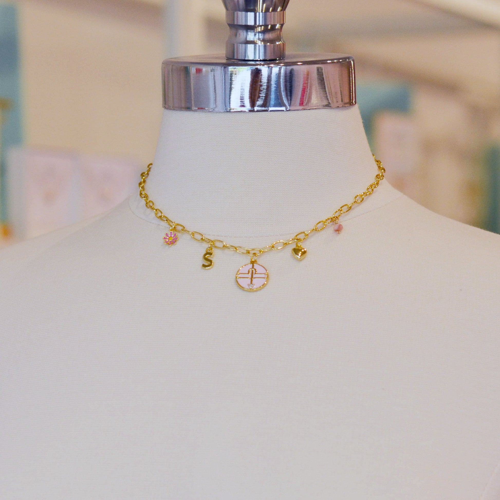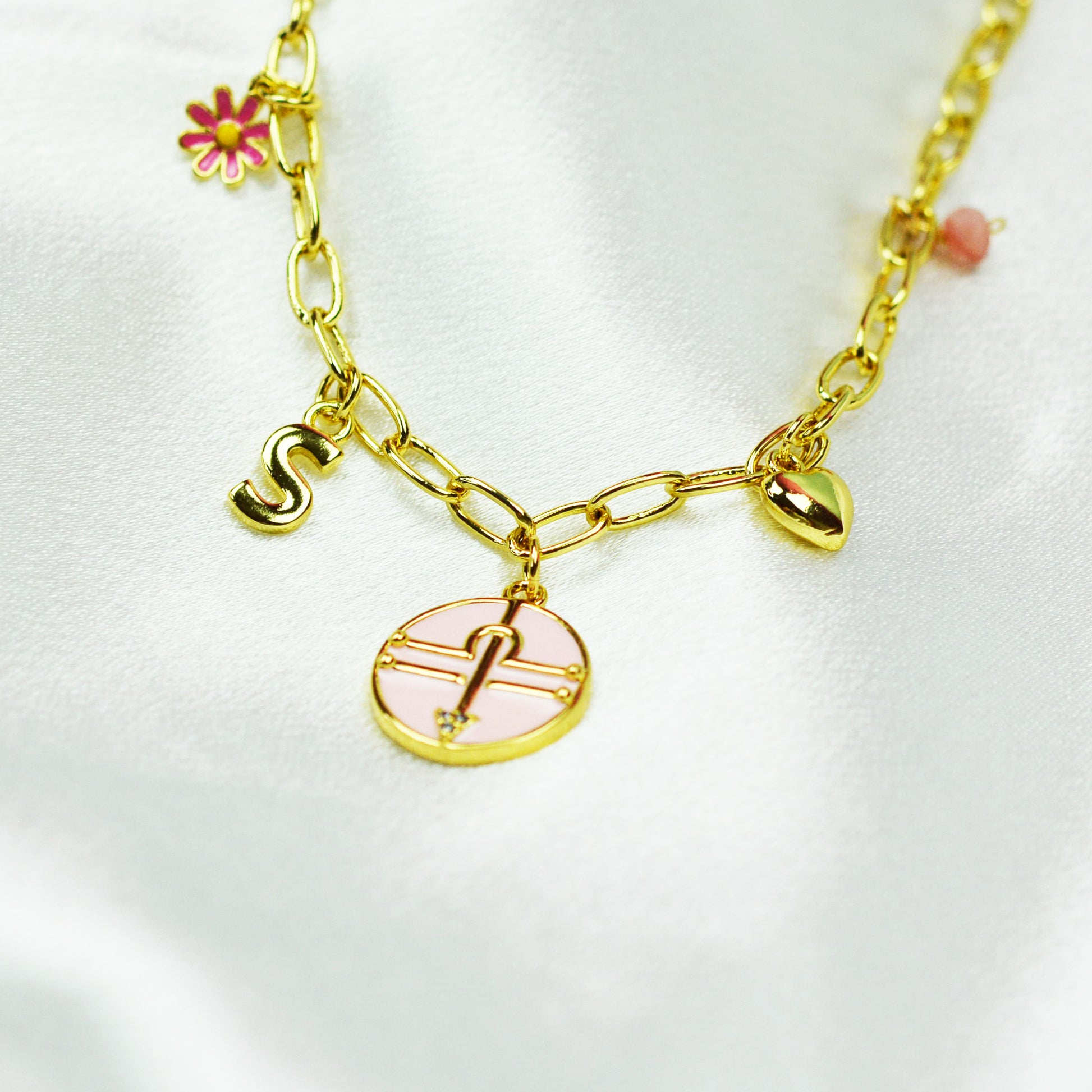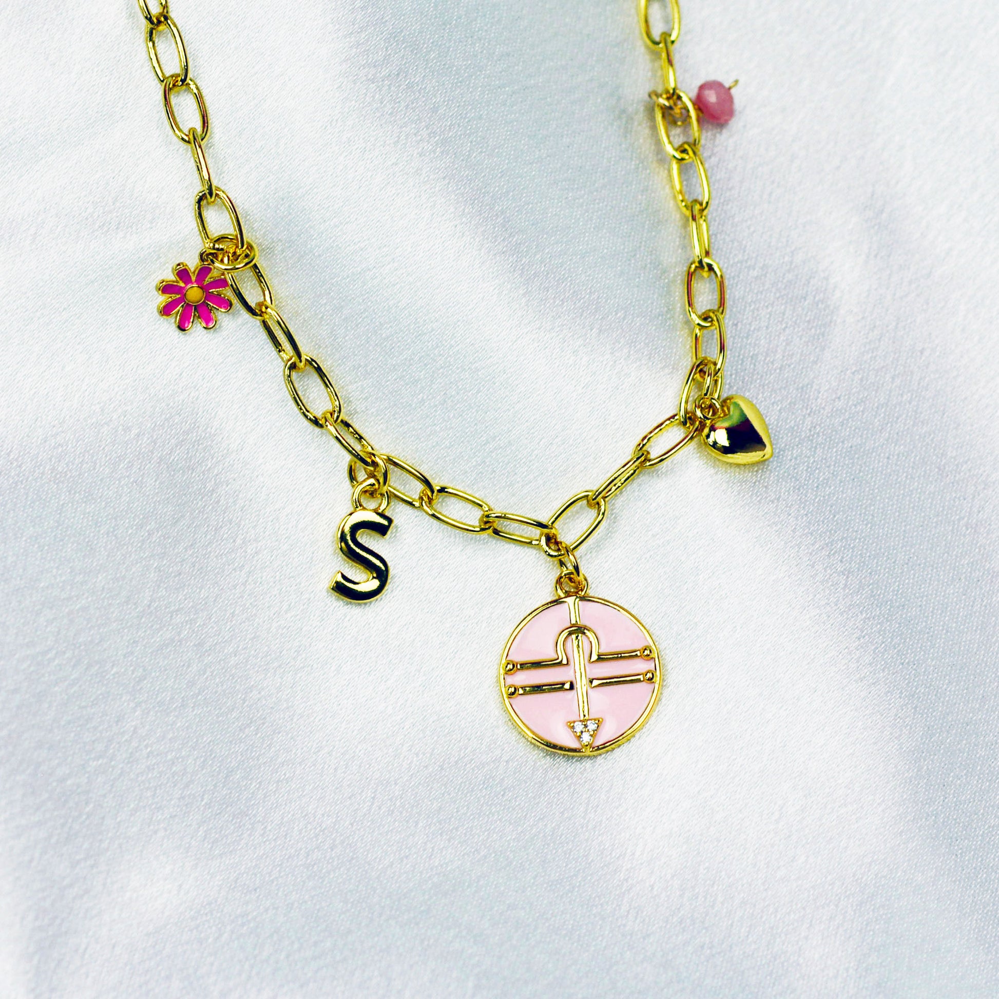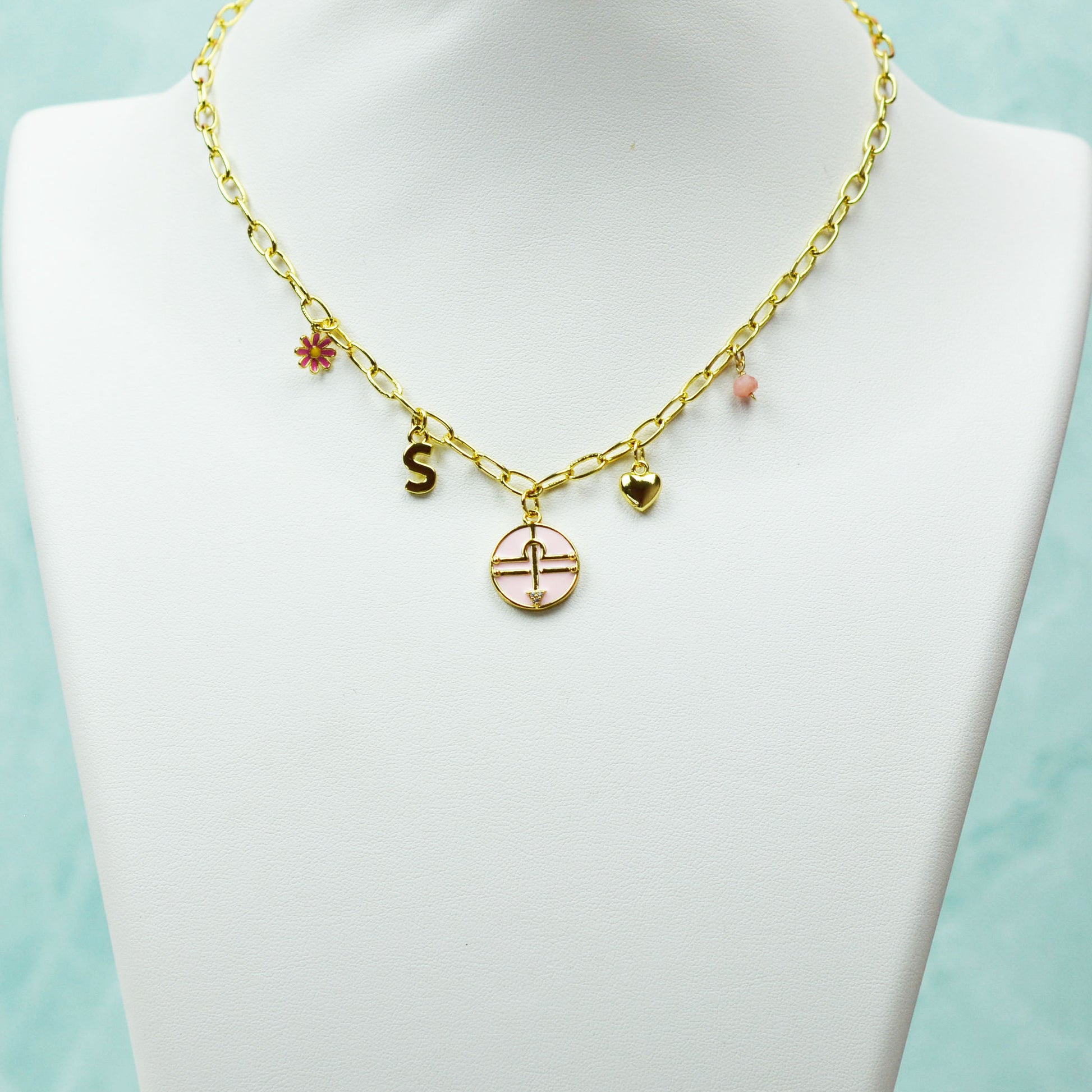 A high quality custom / multi charm necklace. This necklace is made with your zodiac sign, your letter, the birthstone, a heart and a daisy charm. It is made with 18K charms and chain.