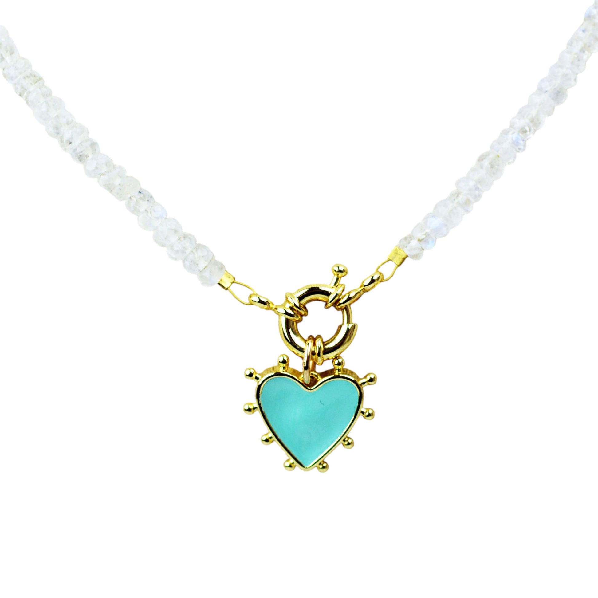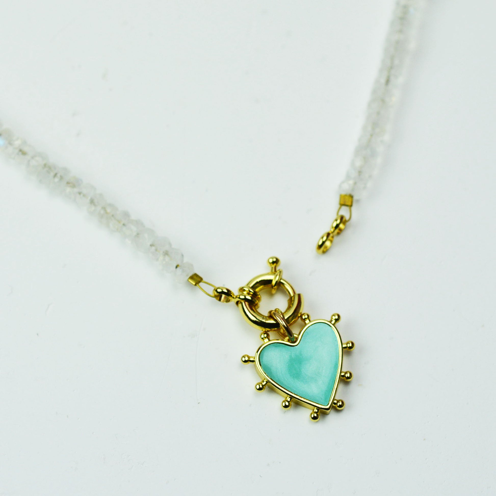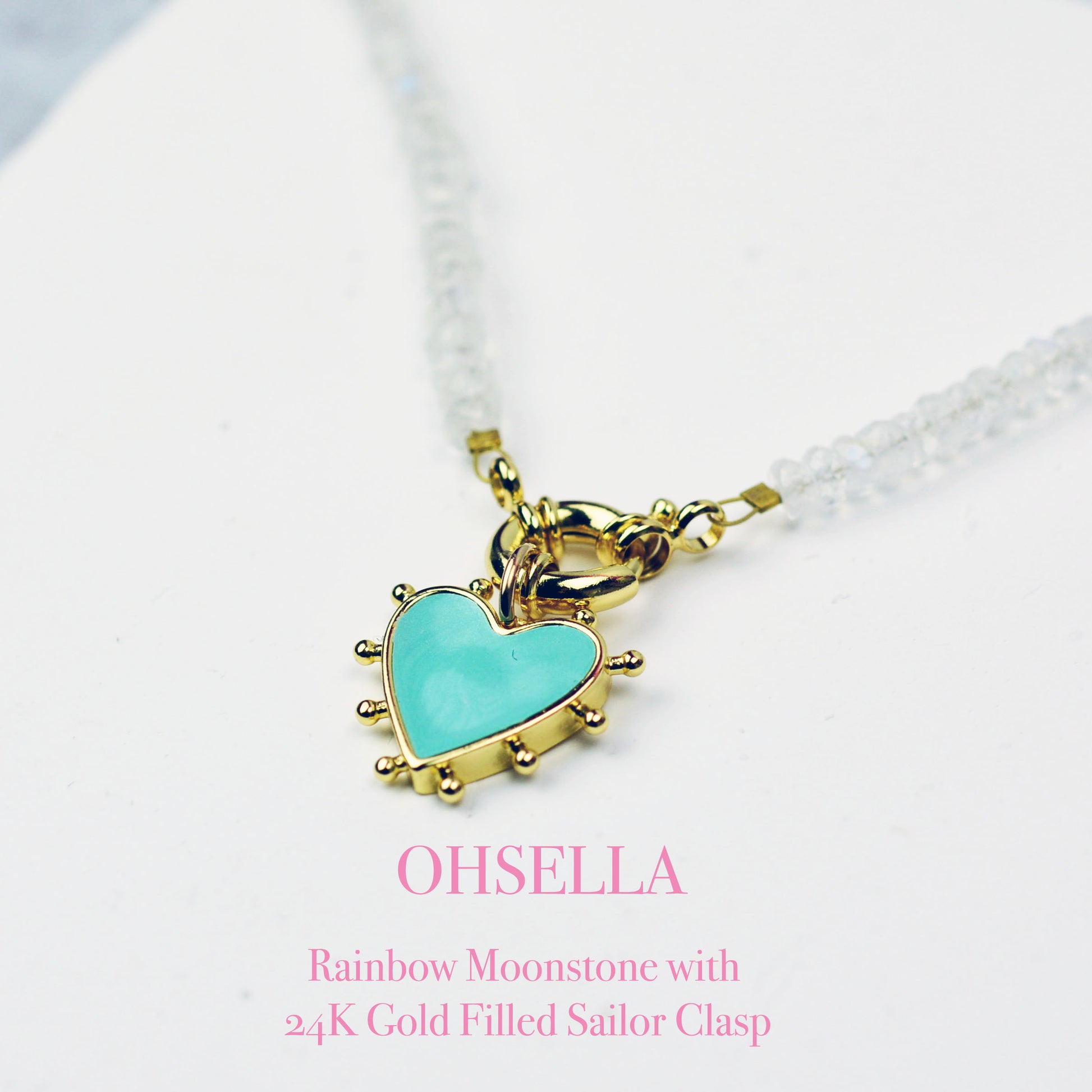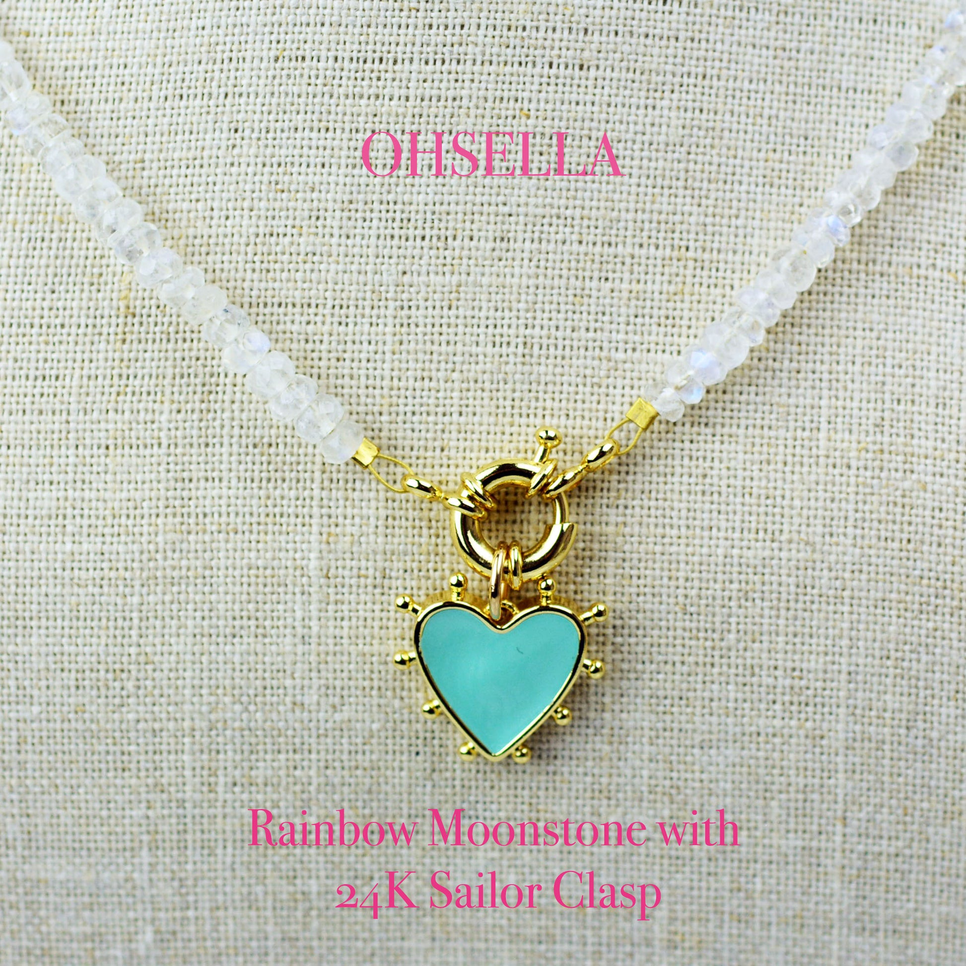 Rainbow Moonstone Beaded Necklace with 24K Gold Filled Sailor Clap and Heart Charm