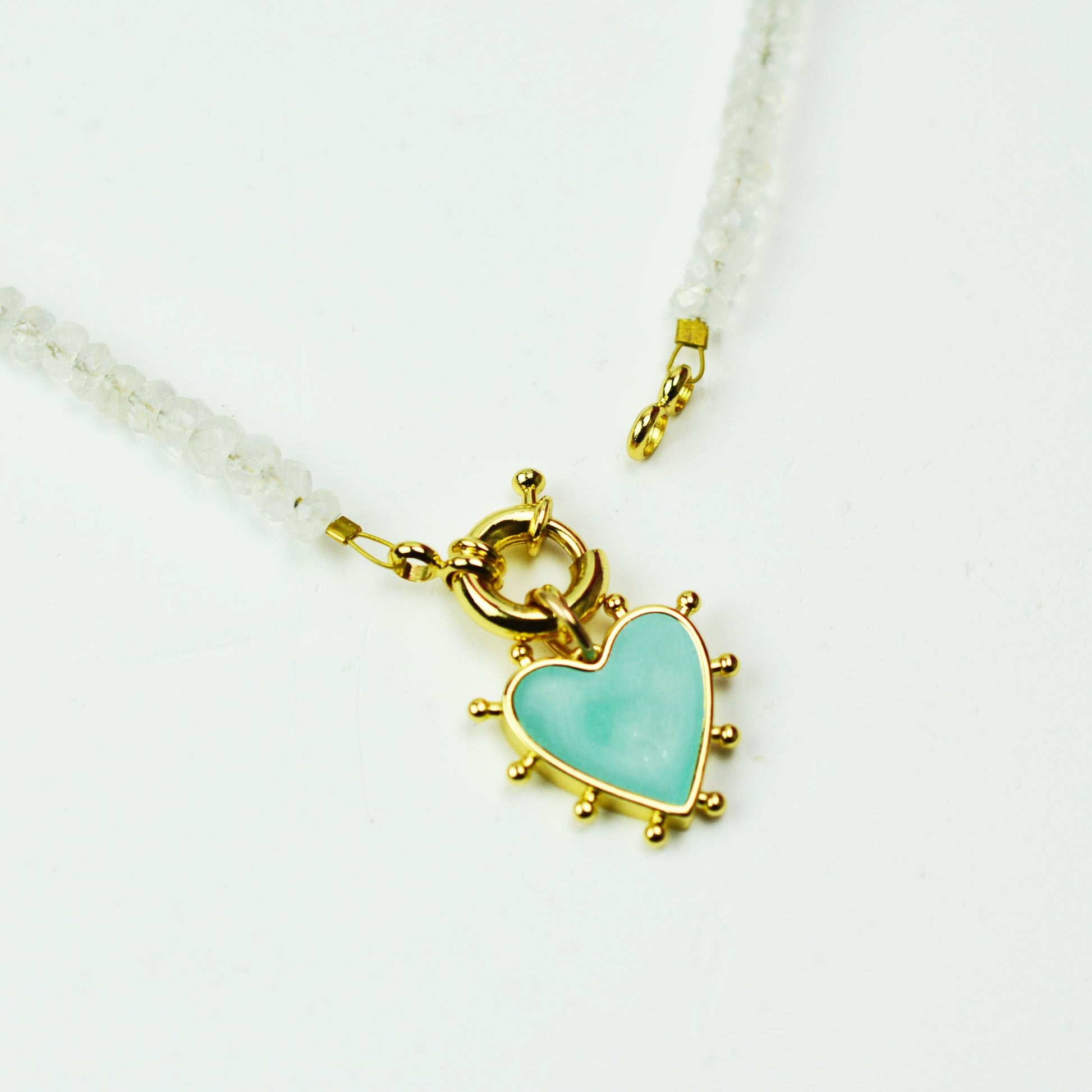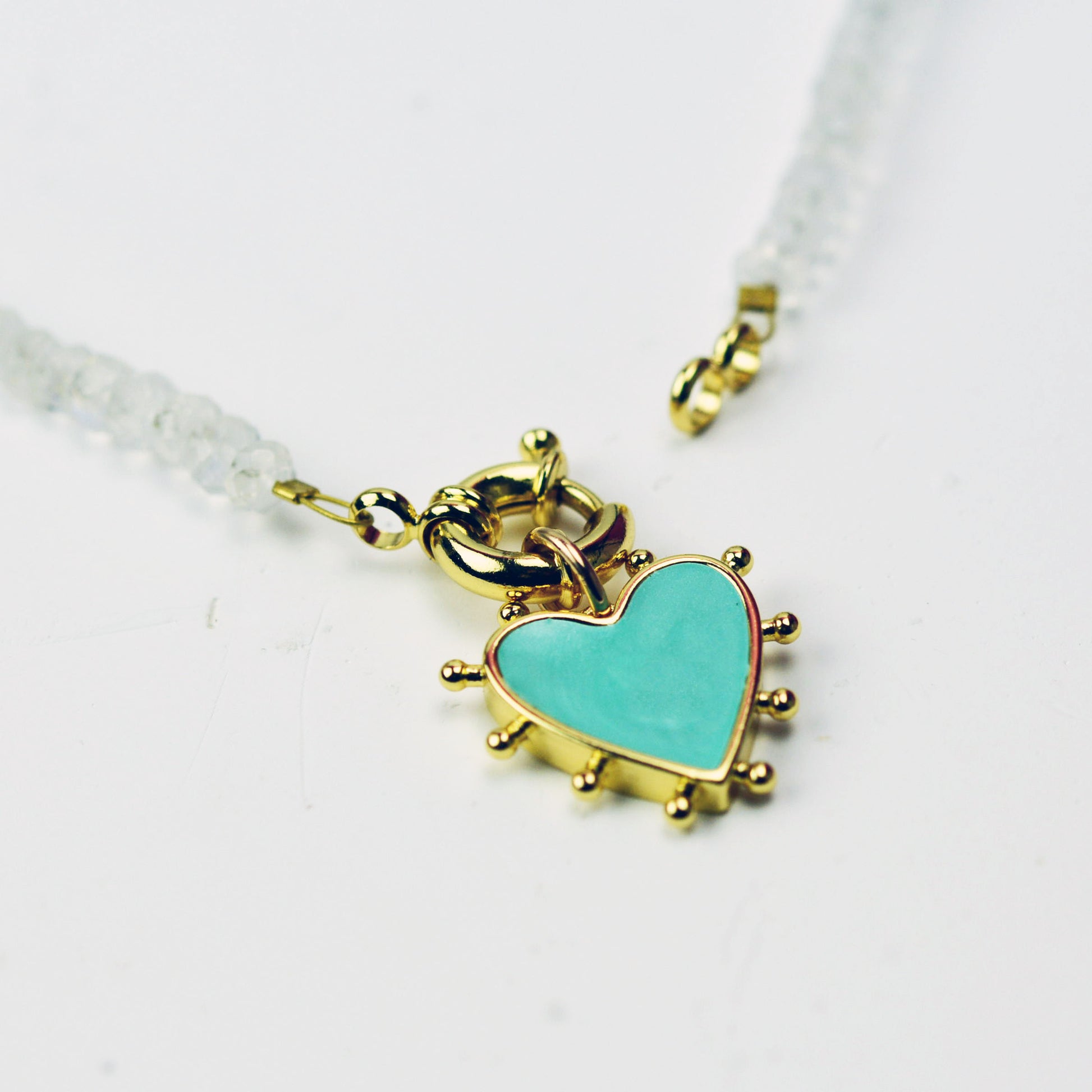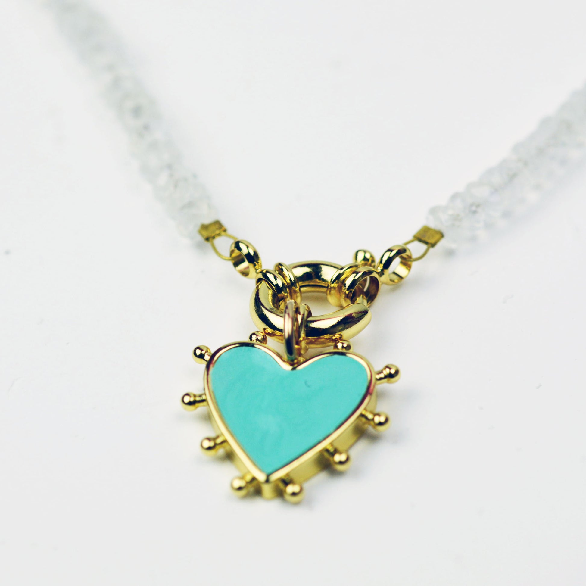 Our Rainbow Moonstone Beaded Necklace with 24K Gold-Filled Sailor Clasp and Heart Charm captures the magic of moonstone’s ethereal glow, with each bead radiating soft flashes of blue and white. This delicate, hand-crafted necklace features a 24K gold-filled sailor clasp for a touch of luxury and is adorned with a charming gold heart, symbolizing love and warmth.