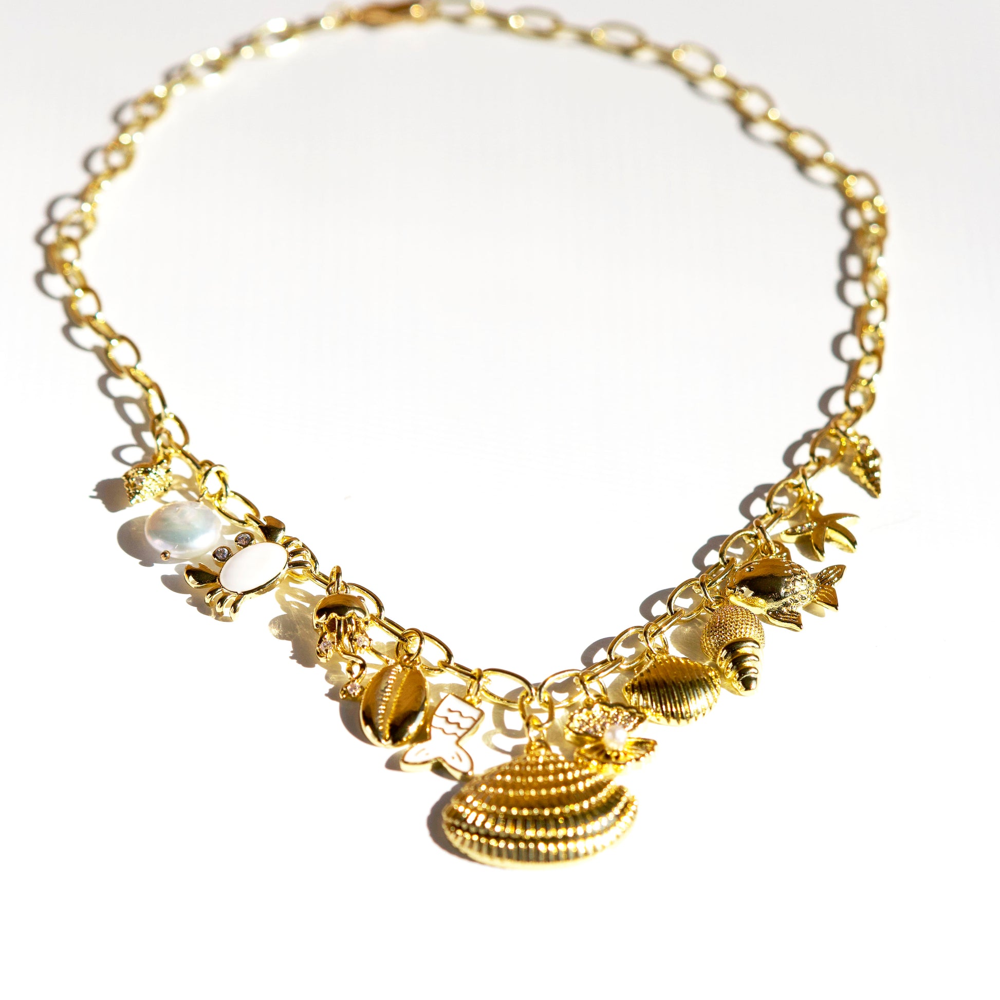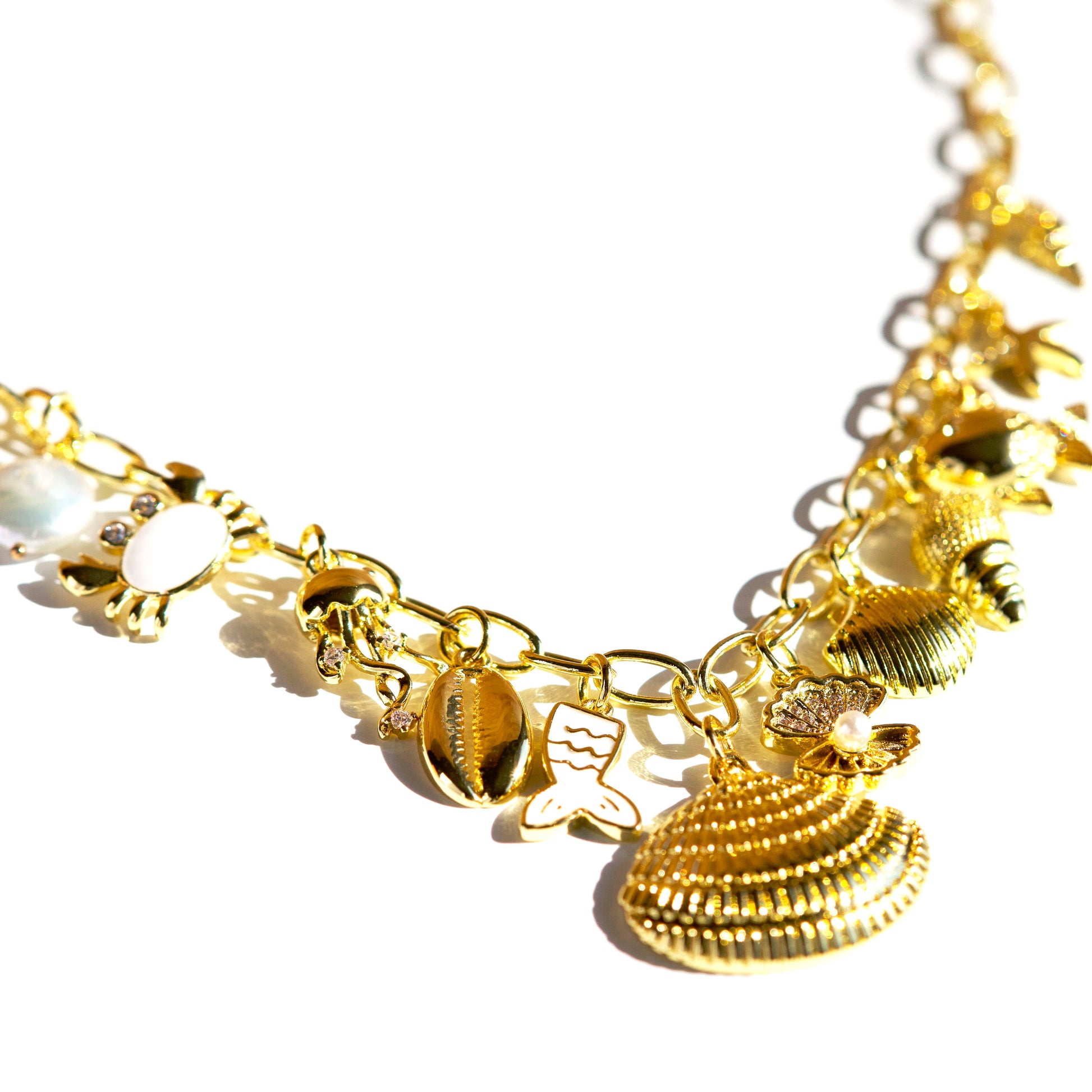 Dive into elegance with our 18K Gold filled Ocean Charm Necklace, a stunning tribute to the beauty of the sea. This exquisite piece features 13 unique ocean-inspired charms, from delicate seashells of various shapes and sizes to a shimmering oyster, a graceful starfish, a mesmerizing jellyfish, a charming crab, and more. Each charm is intricately detailed, capturing the magic of marine life in luxurious 18K gold filled