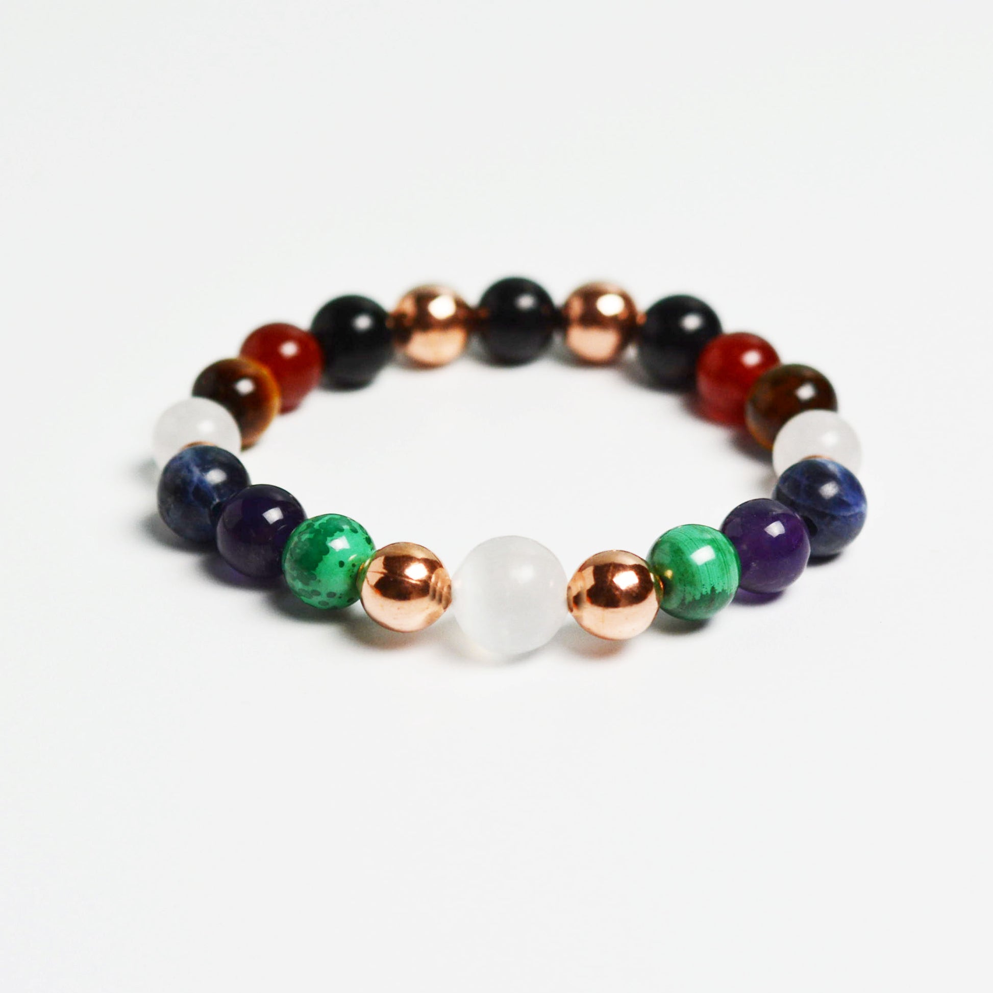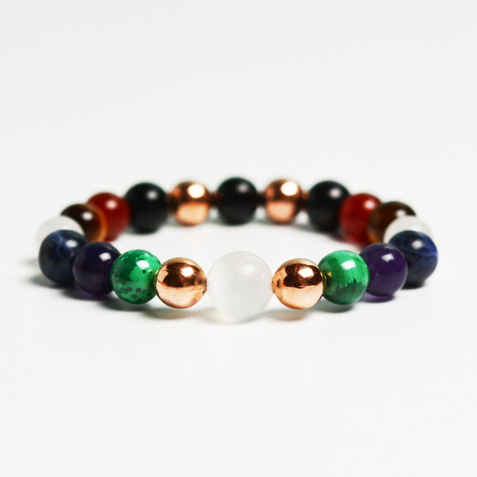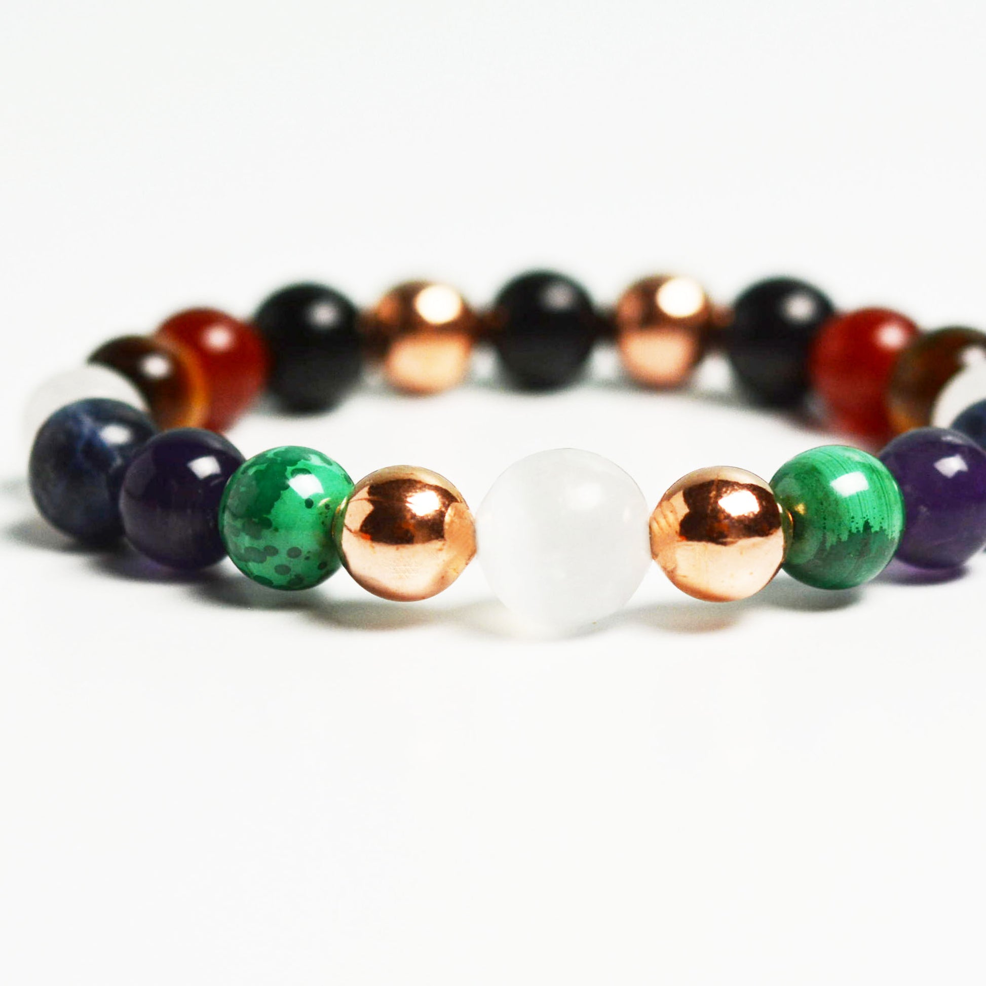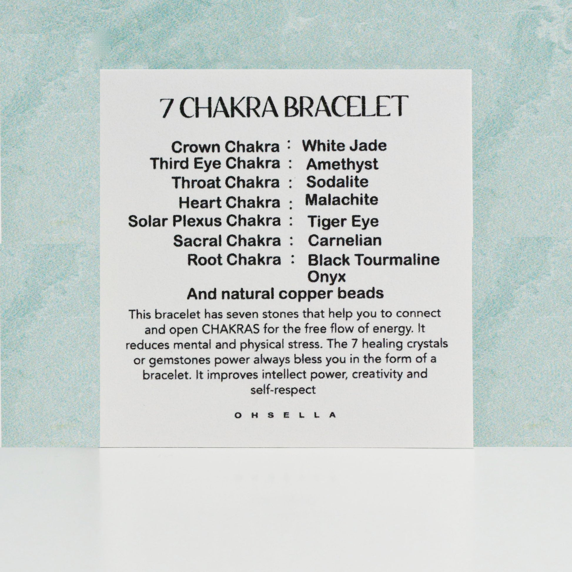 The 7 Chakra Bracelet contains White Jade, Amethyst, Sodalite, Malachite, Tiger Eye, Carnelian, Black Tourmaline, Onyx and Coper Beads. This bracelet has seven stones that help you connect and open chakras for the free flow of energy. It reduces mental and physical stress.