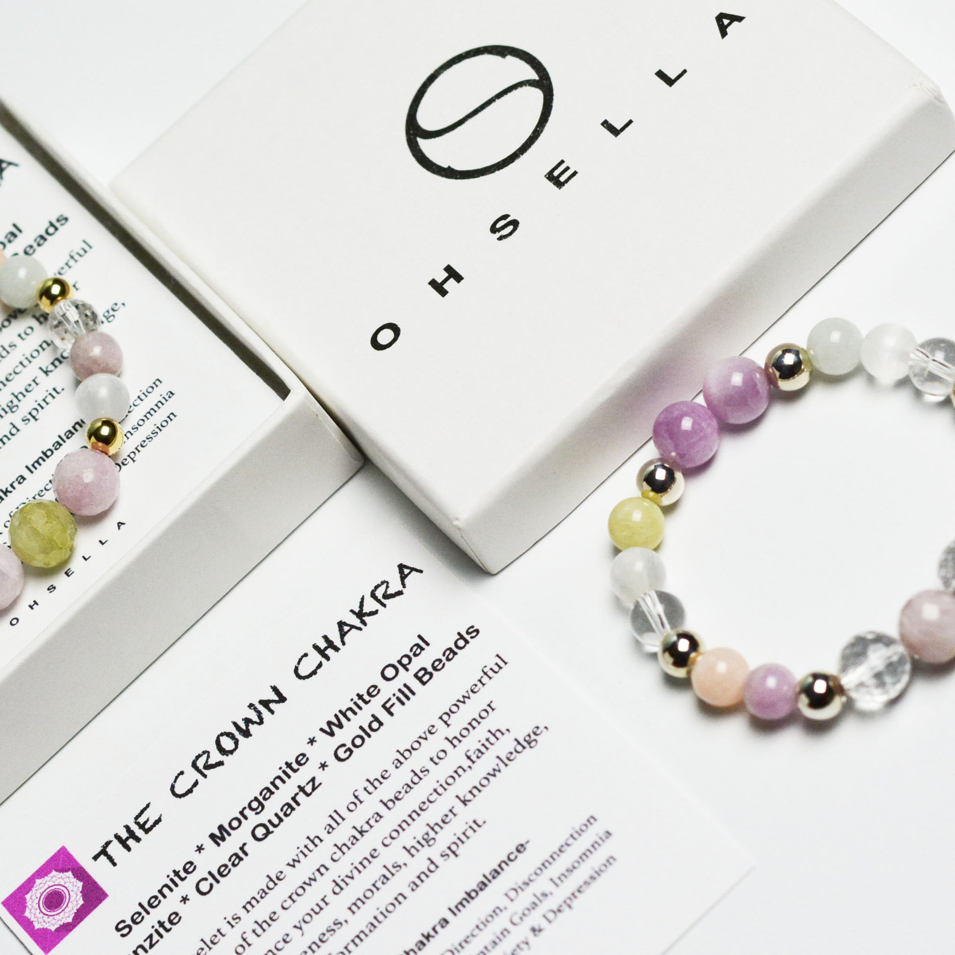 The Crown Chakra bracelet contains Selenite, Morganite, White Opal, Charoite, Clear Quartz and Gold Fill Beads. This bracelet is made with a powerful mixture of the crown chakra beads to honor and enhance your divine connection, faith, inspiration, oneness, morals, higher knowledge, transformation and spirit.